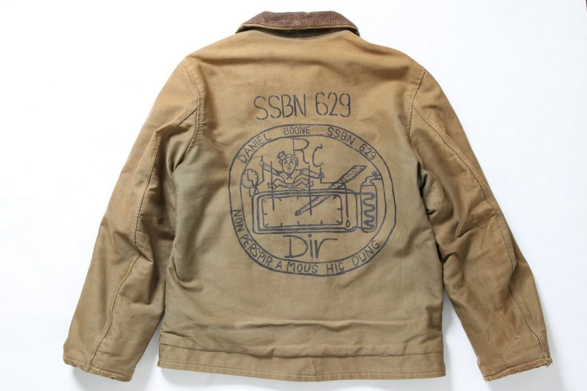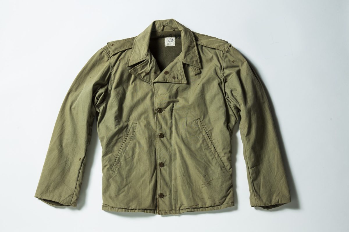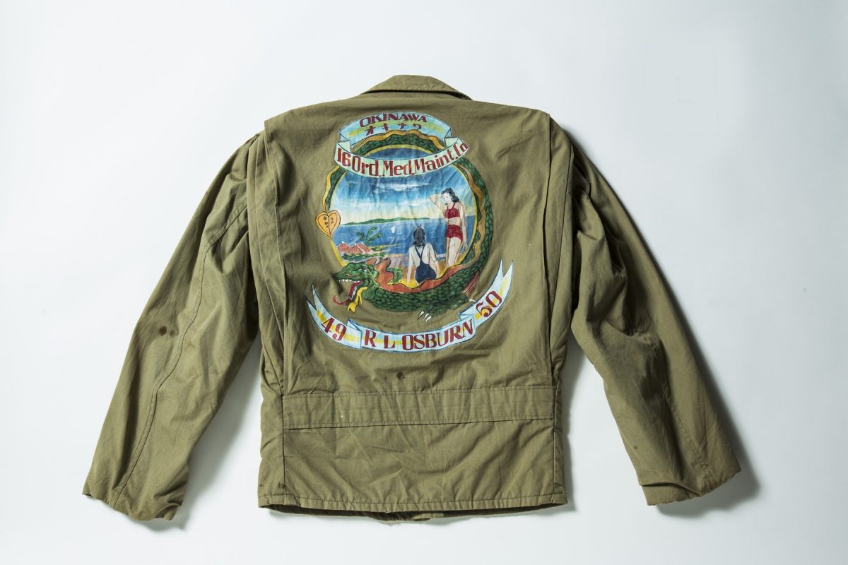 陸軍のフィールドジャケットM-41の背中に、なぜか海水浴に興じる女性の姿が……よく読むと、そこにはオキナワの文字が。周囲を竜で囲み、デザイン性も高い。