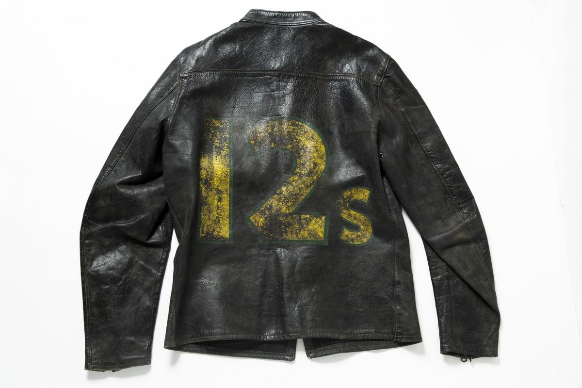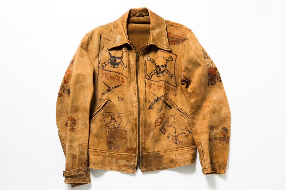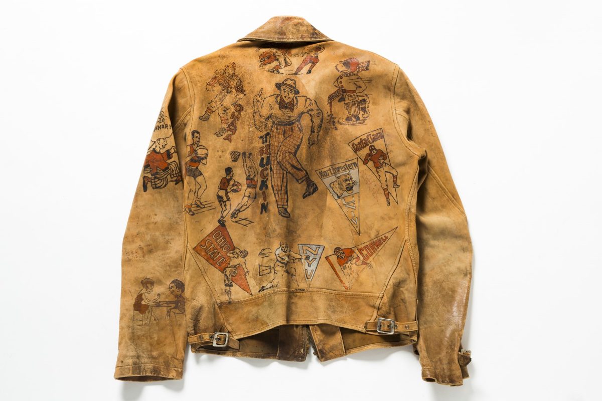手書きの落書きが散りばめられたスポーツジャケット。見ているだけで、当時の文化が見えてくる。スカルやライフルのレイアウトのバランスなど、参考になる点も多い。