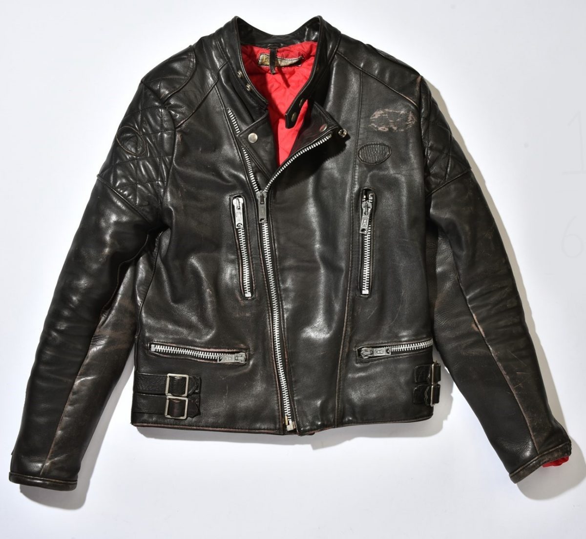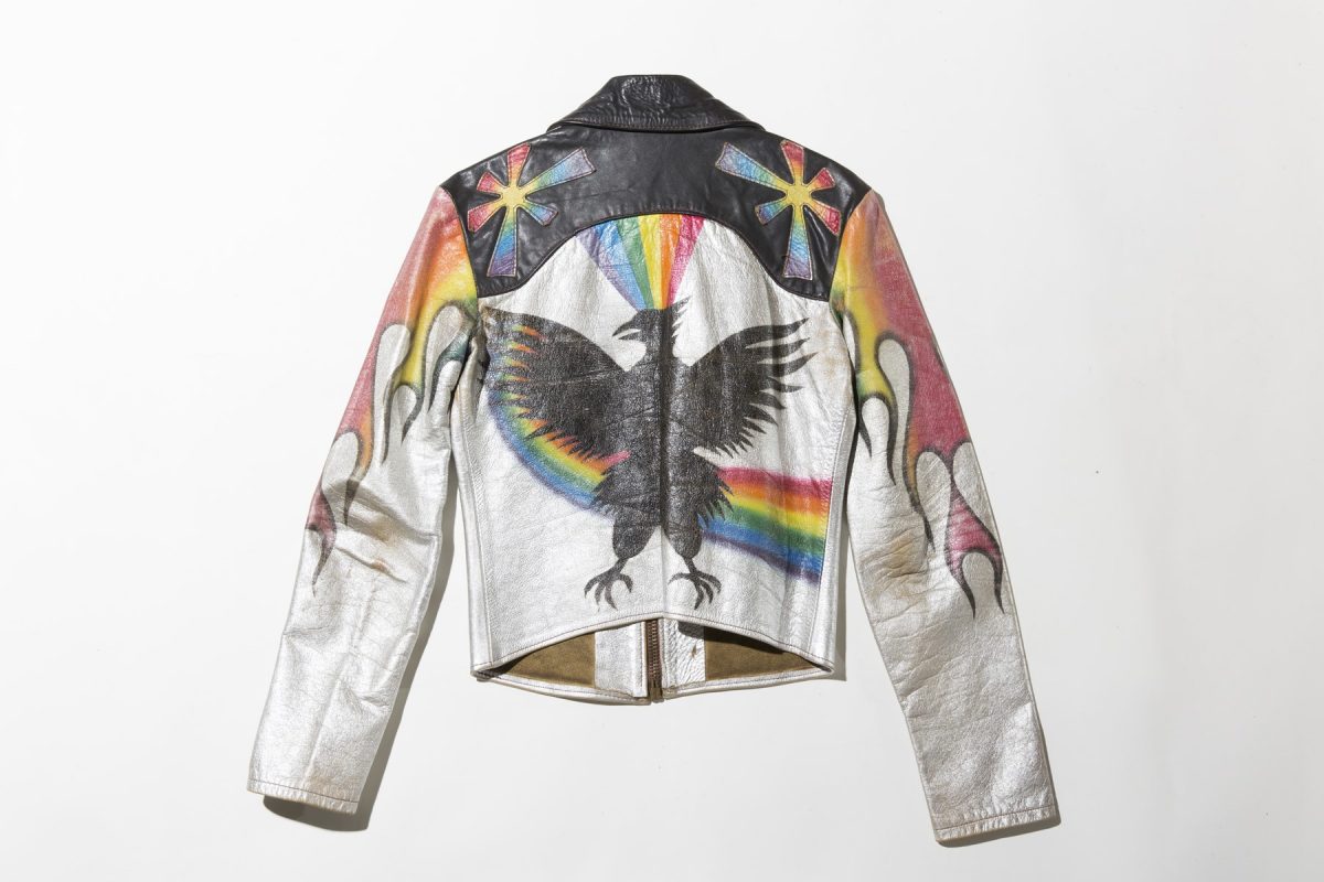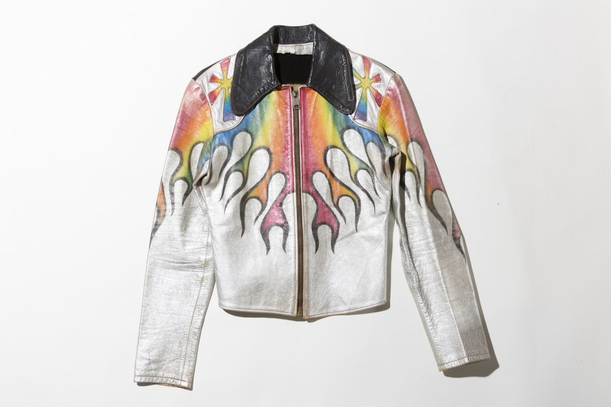 1970年代には、奇抜でクリエイティブなレザージャケットが数多く登場した。こちらもそのひとつ。ホワイトボディに、エアブラシでサイケな世界観を描いている。
