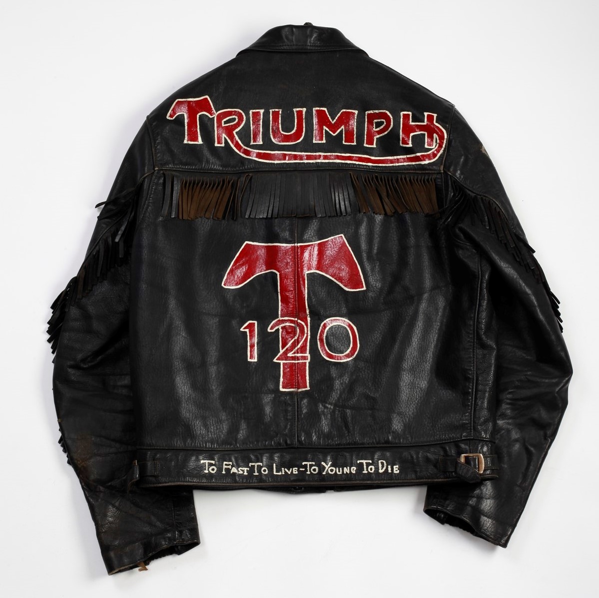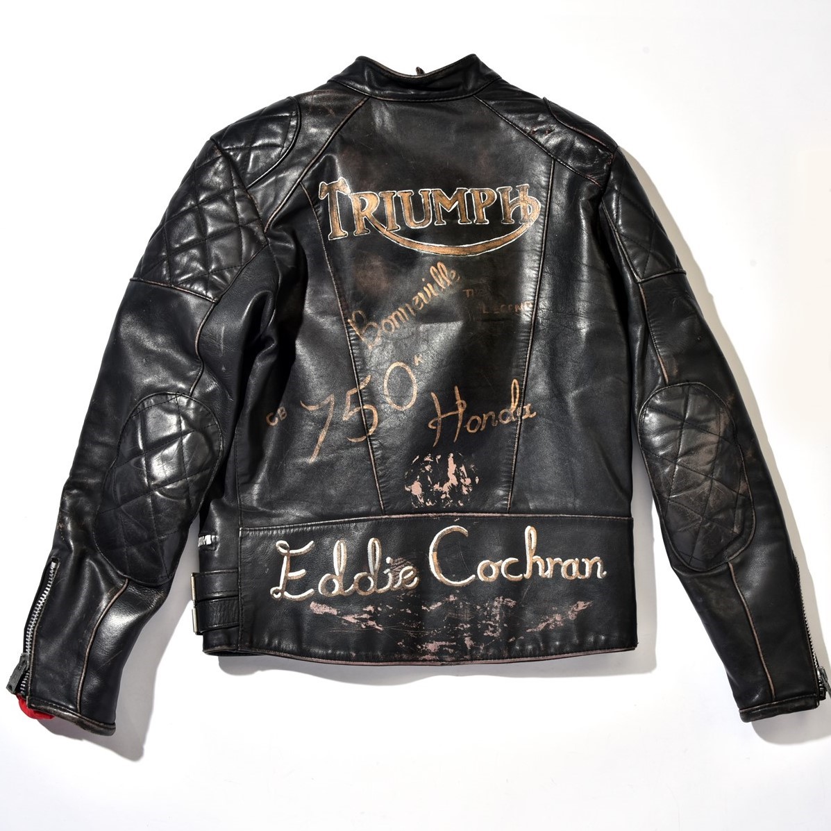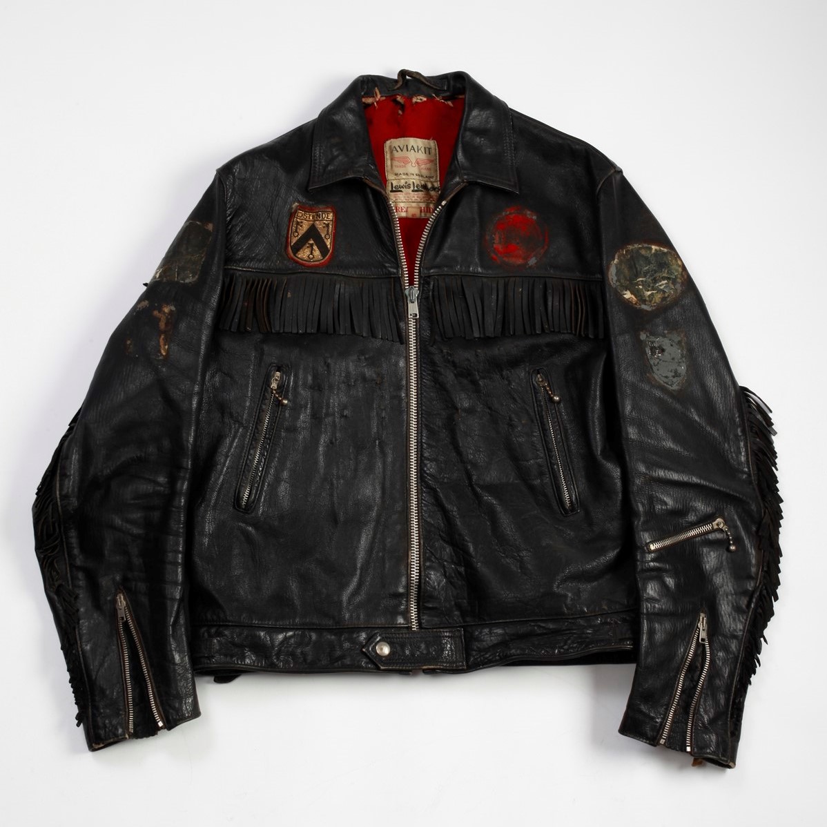 1970年代には、奇抜でクリエイティブなレザージャケットが数多く登場した。こちらもそのひとつ。ホワイトボディに、エアブラシでサイケな世界観を描いている。