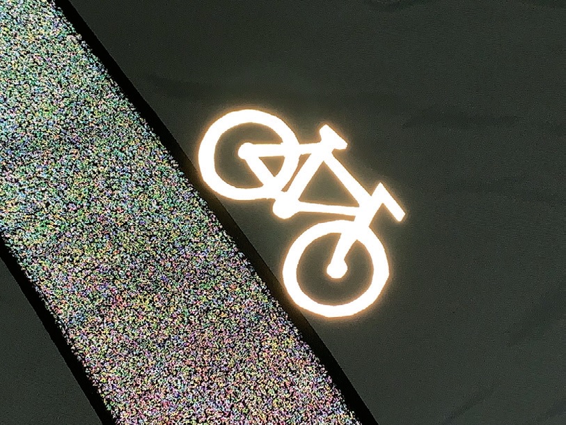 セルフカスタムで貼り付けた自転車シルエットのリフレクターパッチ。その効果を調べるべく、暗闇でiPhoneを使いフラッシュ撮影。まぶしいぐらいに良く光を反射してくれる。