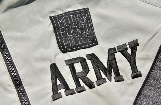 二つのワンポイントを落とし込んだ、セルフカスタムIPFUジャケットが完成。ARMY刺繍の上にワッペンを配置して、V型ラインを下り坂に見立ててリフレクター自転車パッチを貼ってみたぞ。