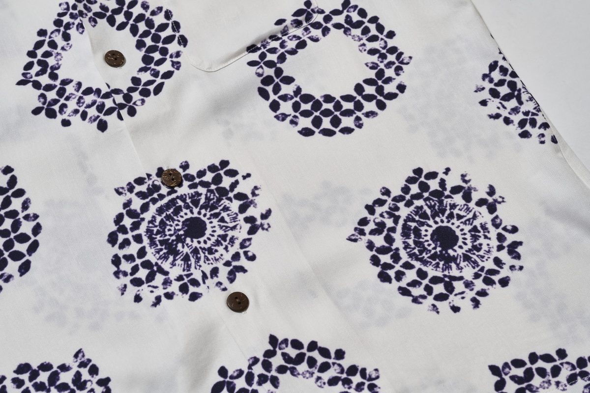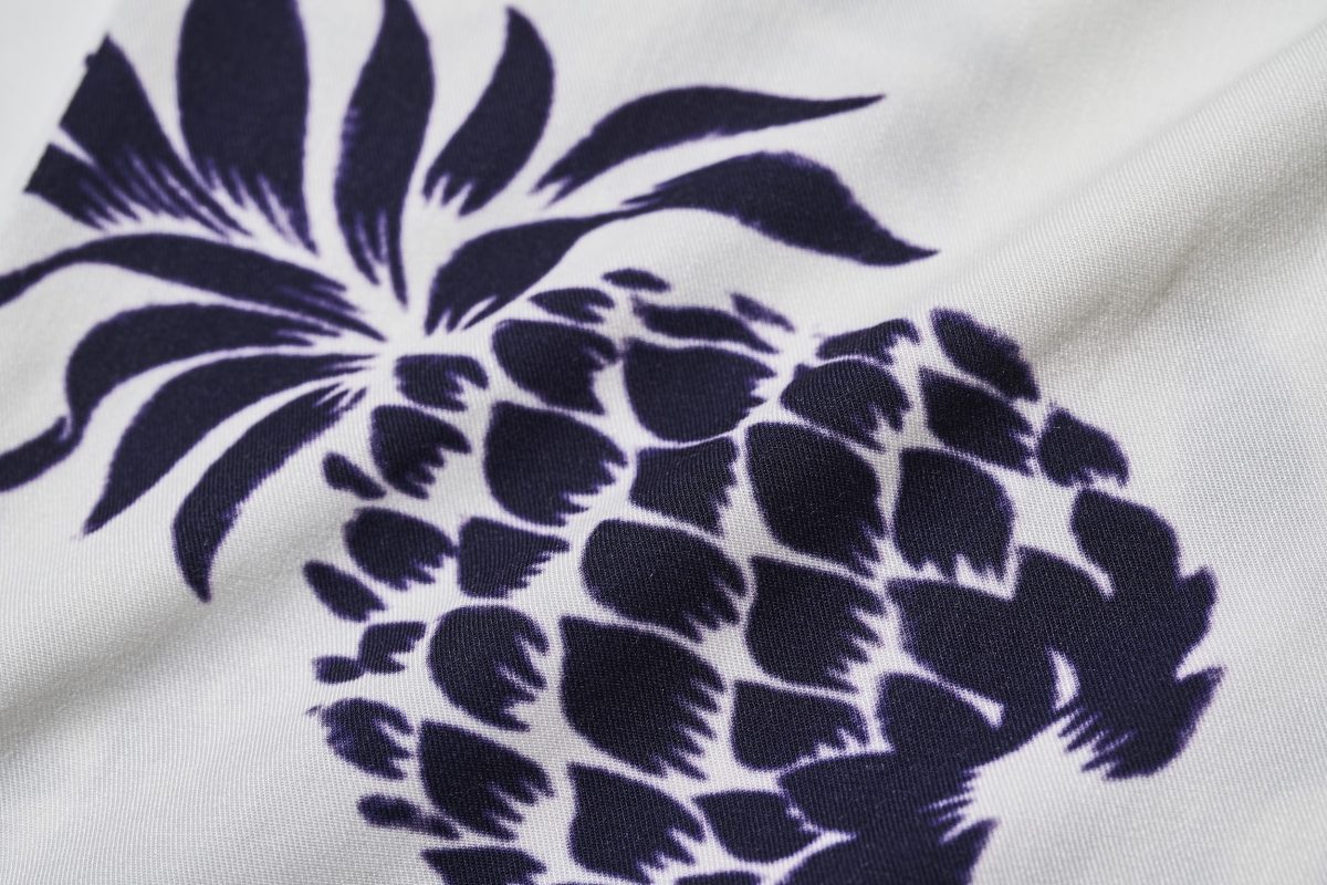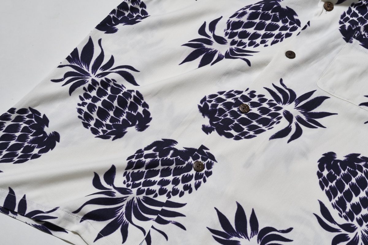リゾートの果物といえばパイナップル。その意匠をインディゴ抜染した際の、微妙な擦れ具合までをプリントにて表現させたアロハシャツ。トロピカルテイストな柄なので、夏真っ盛りのリゾートウエアとして重宝するはず。
