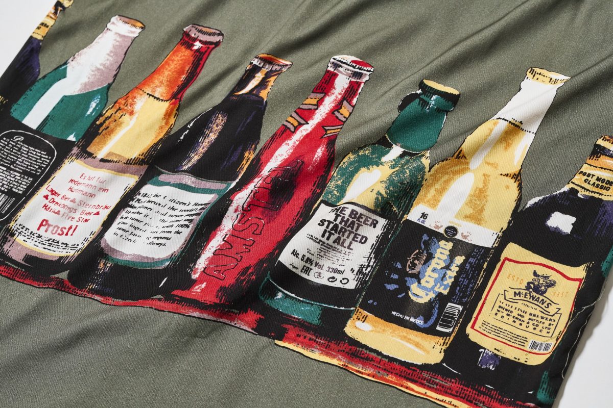 コロナビールを筆頭に、リゾート地で楽しめそうな色鮮やかなビール瓶をデザイン。フロント側はビールのラベルだが、バック側では表情が異なり、しっかりビール瓶の裏ラベルもプリントされているのがユニークだ。