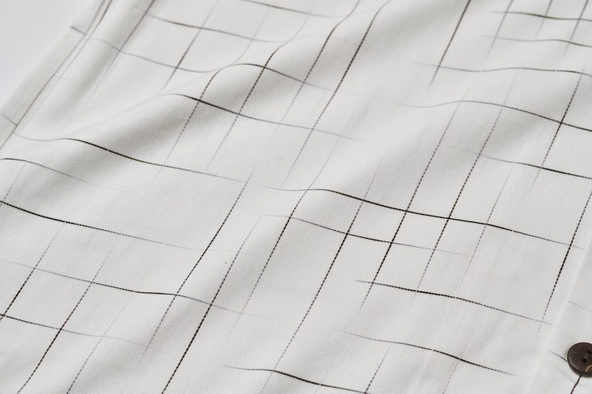 日本の織物技法である「絣(かすり)」をプリントで表現。細かい織りの表情もしっかりと再現している。シンプルな幾何学模様は着こなしに取り入れやすい。