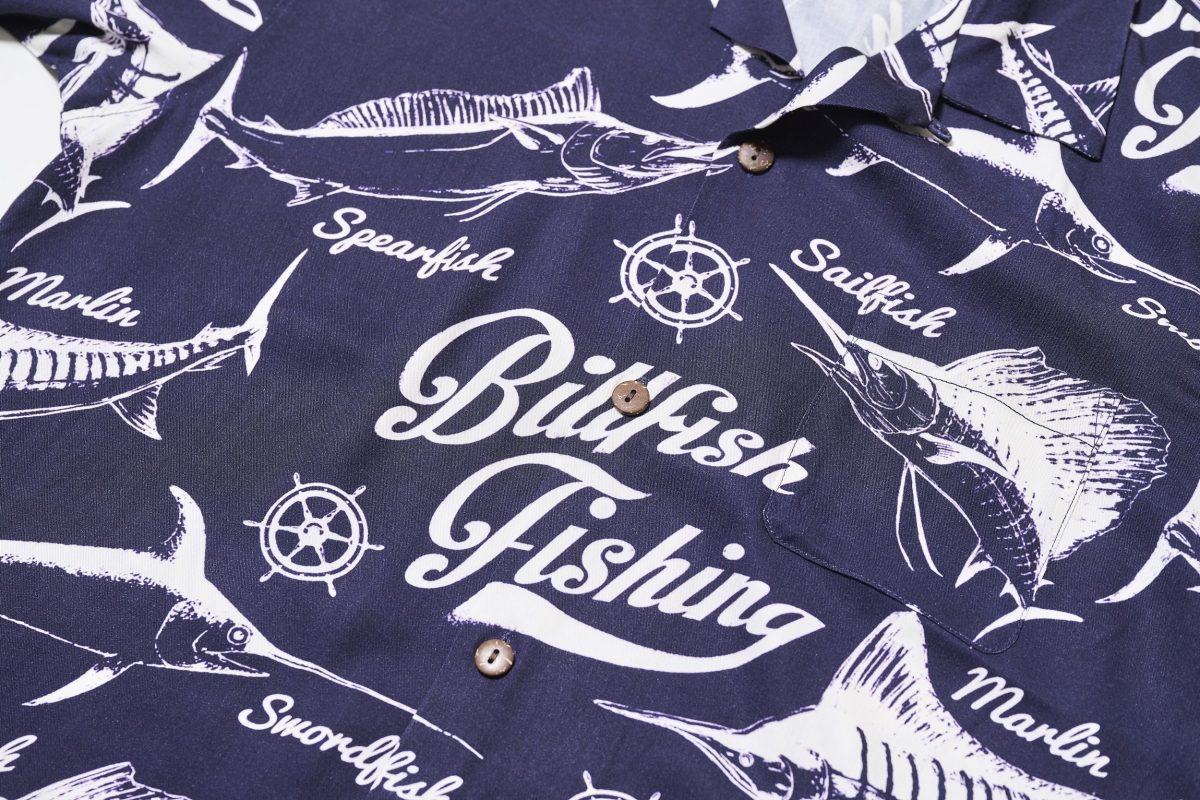 フィッシング好きにはたまらない魚拓柄デザイン。カジキマグロを始めとする4種類の魚拓を配して、マリンテイストなオールーオーバーデザインに仕上げている。