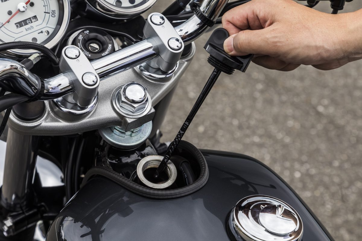 オイル注入口もずっと変わらずにこの位置のまま。車体のチェックやメインテナンスを自分ですることで、より愛車との距離は近くなる。