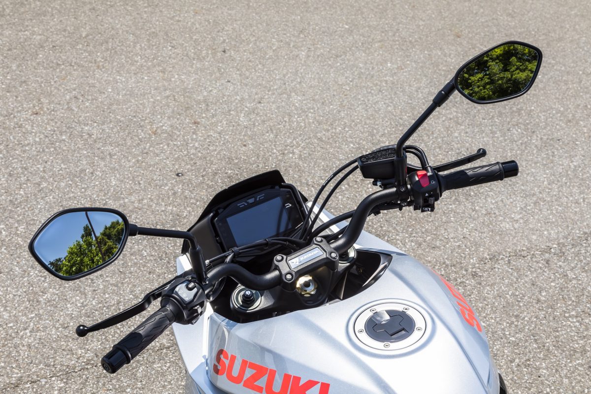新型カタナの特長のひとつがこのアップハンドル。なお左側のグリップ横のスイッチで、トラクションコントロールを設定できる。
