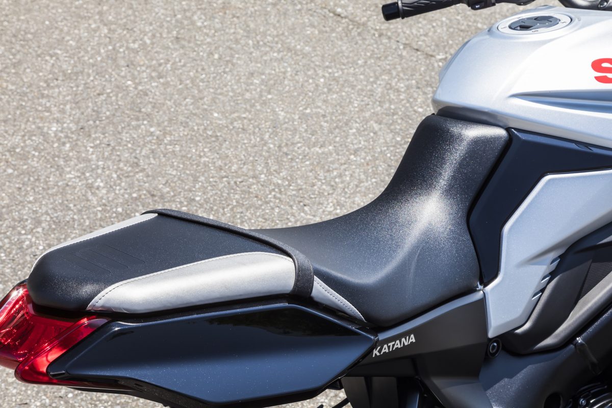 旧型カタナの意匠を感じさせるシートデザイン。シート高は825㎜だが、前方をギュッと絞り込むことで足付き性を向上させている。
