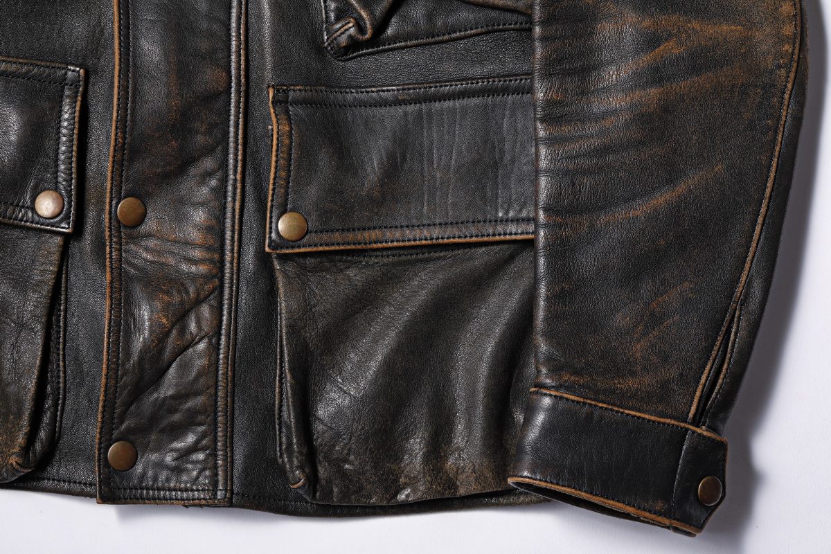 英国ライダースの定番とも言えるシープスキン。革の繊維自体に空気を多く含んでいるため保温力に優れ、柔らかい着心地が特徴。他の革に比べ経年変化も早く着込む程に艶のある表情を生み出す。革は茶芯を採用している。