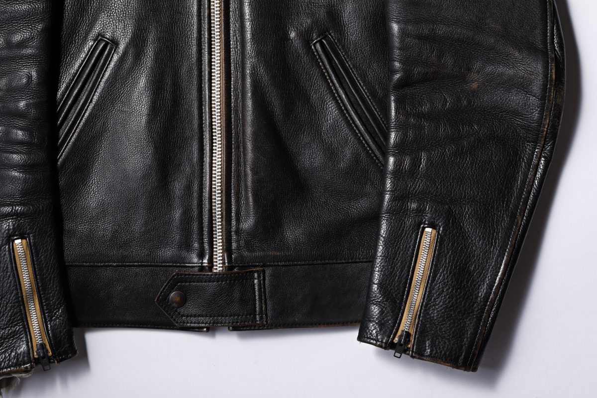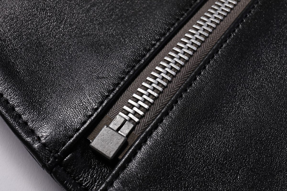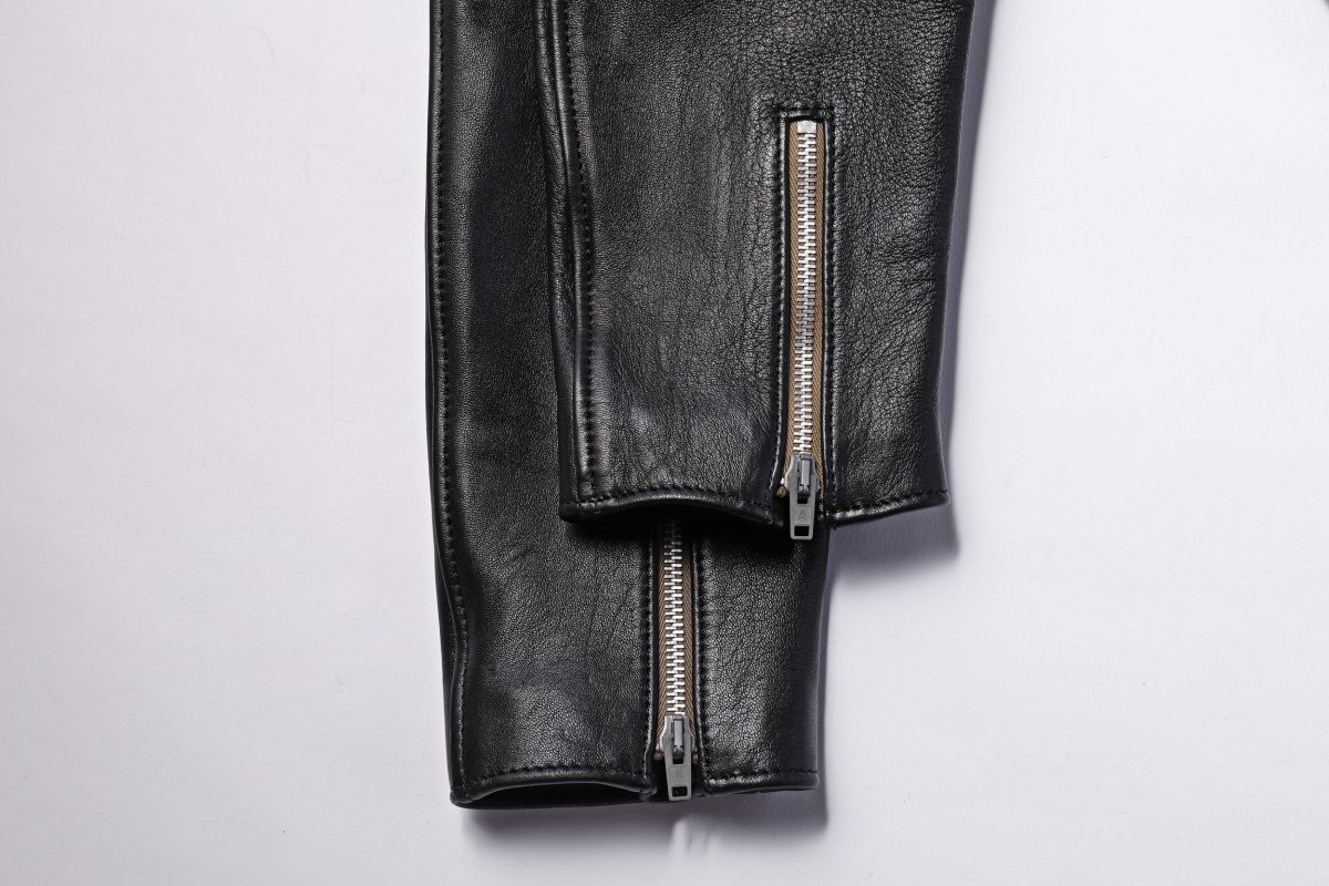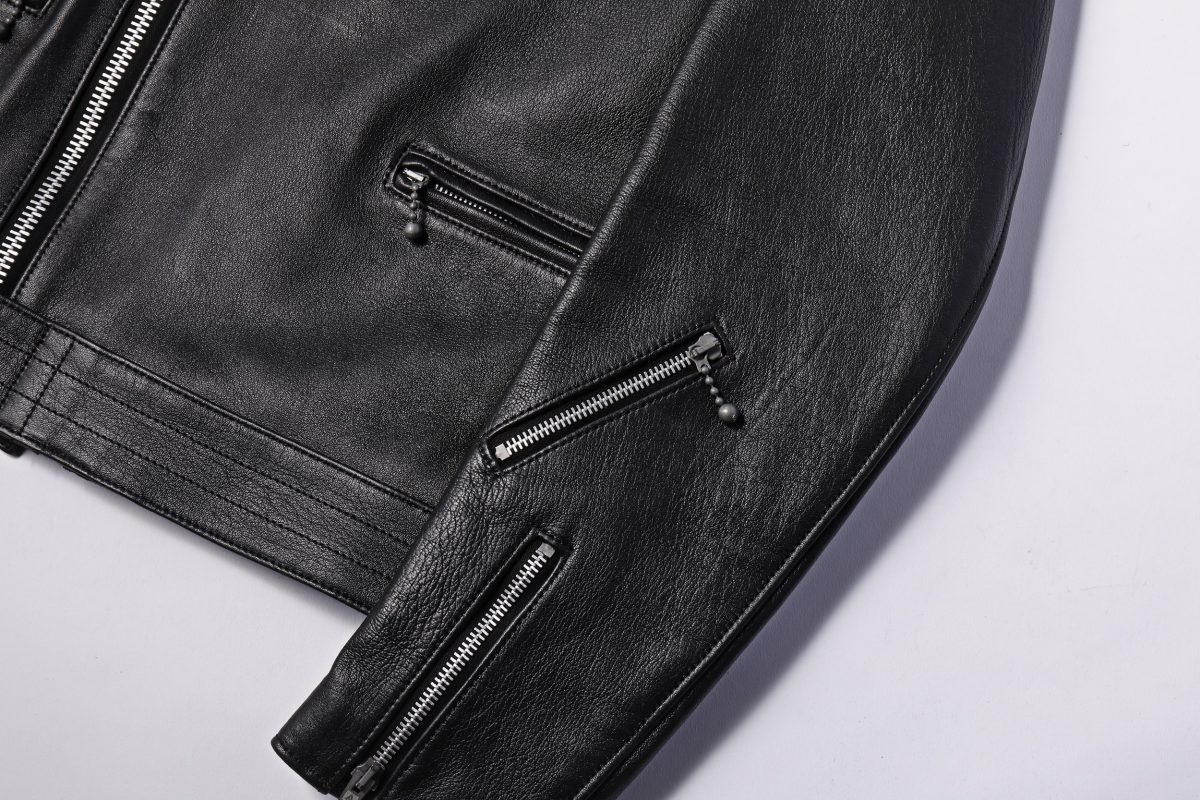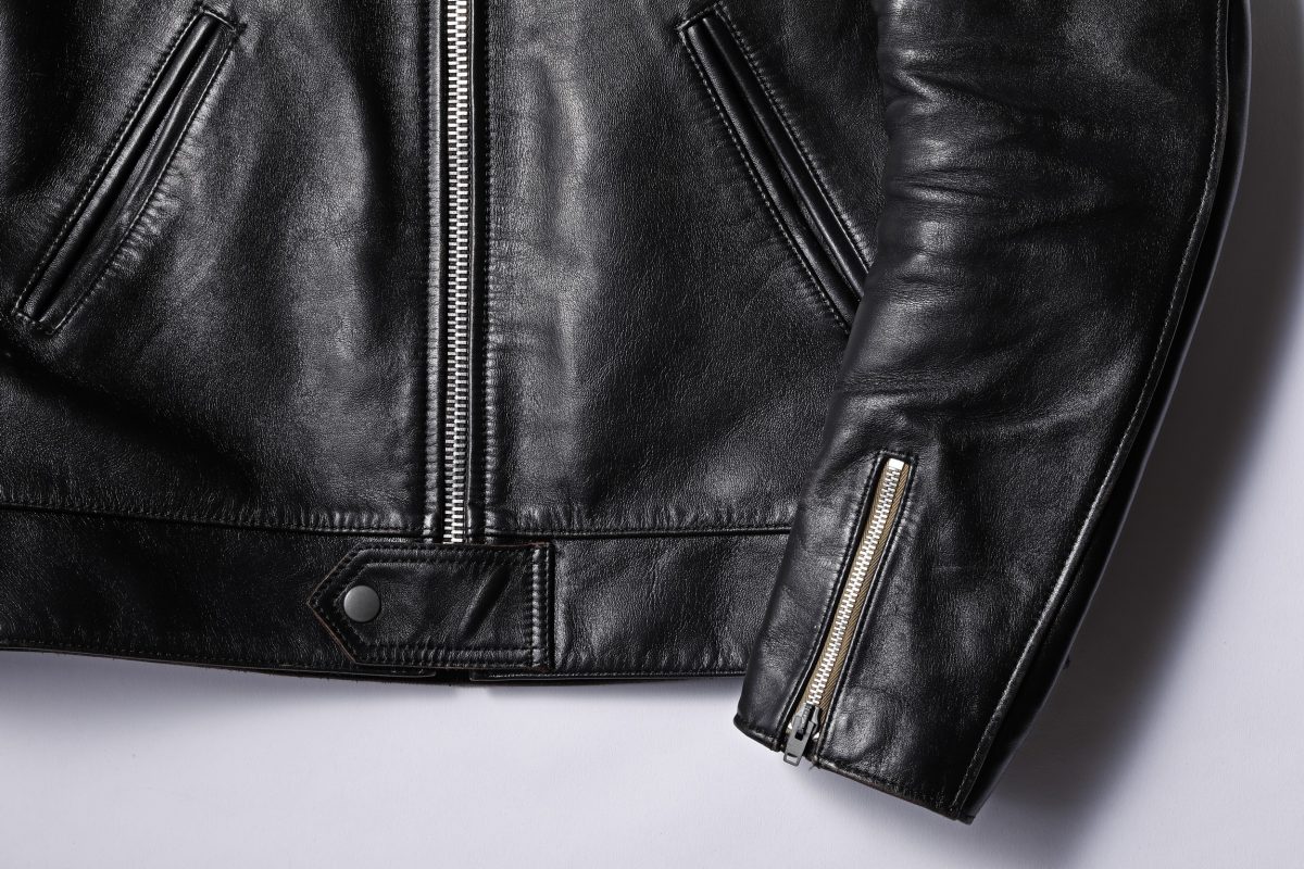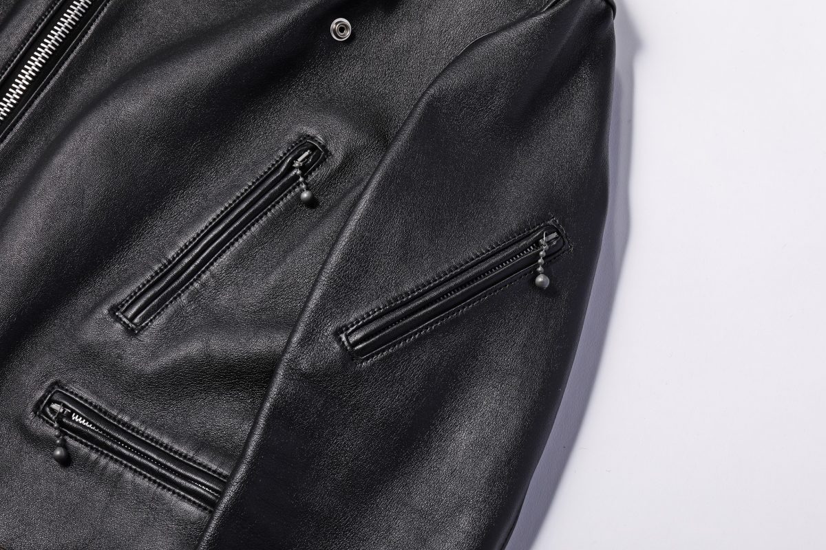 英国ライダースではおなじみのディテールとも言える袖ジッパー。もともとはバイク乗りがコインなどを入れるために作られたポケットで、手首と二の腕付近に追加できる。引き手にはボールチェーンが備わり、デザインのアクセントとしても有効だ。