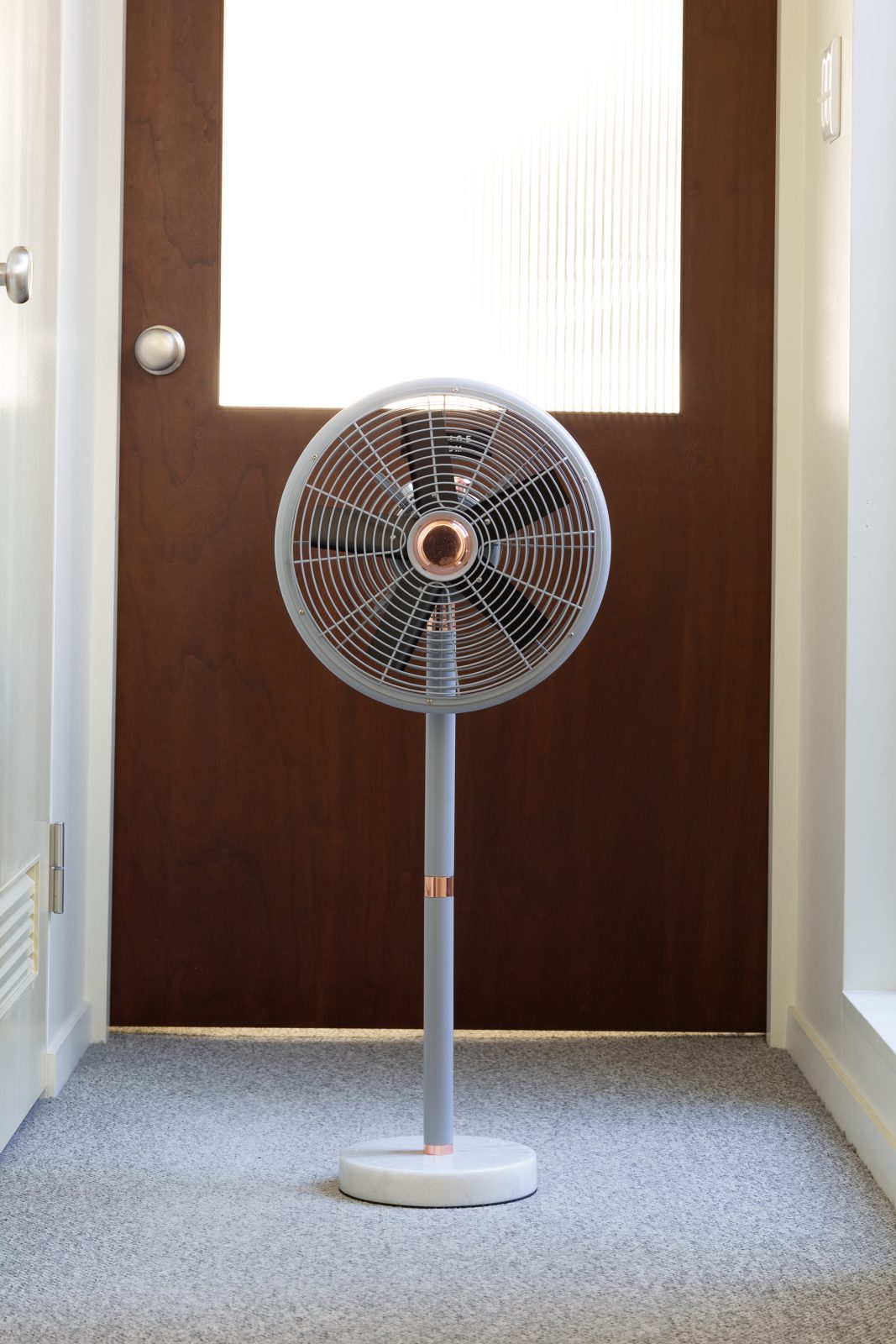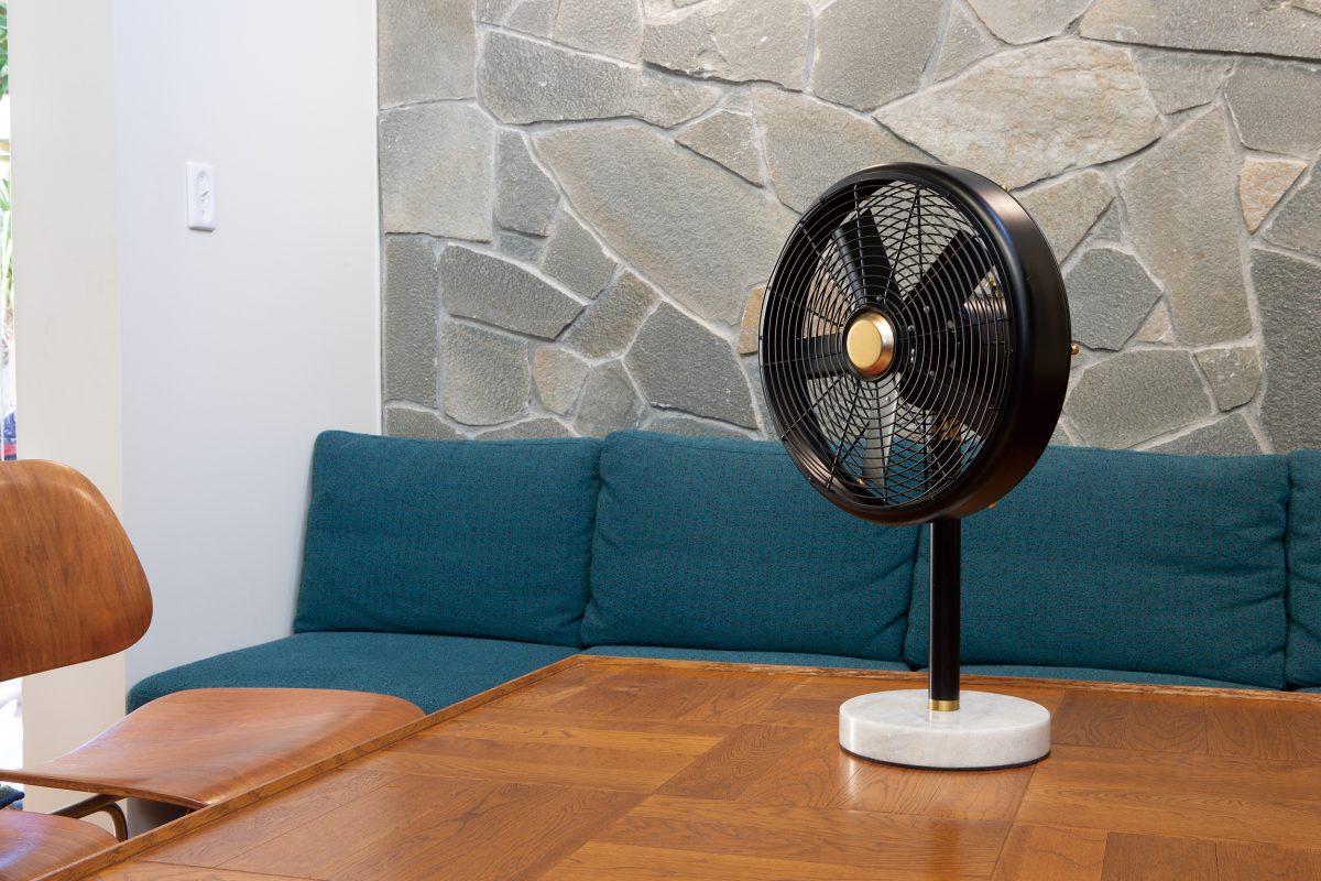 静音性の高さと省電力とパワフルさを兼ね備えたDCモーター採用の扇風機。機能だけでなくデザインにもこだわっており、ベースには大理石を、ポイントで真鍮やメッキパーツを使用しているインテリアとしても秀逸だ。