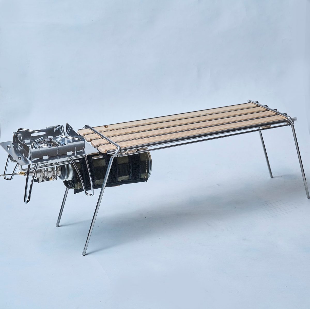 ソロキャンプの定番ともいえるSOTO ST310に小さなウッドテーブルを装着できる。A38grateが1万7600円、38GT310が1万6500円、SOTO stoveが6380円