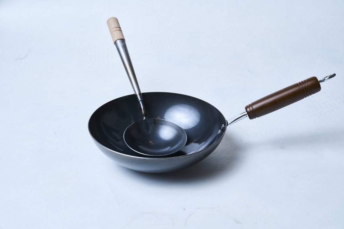 キャンパーのために製作したこだわりの中華鍋。小ぶりながらも本格中華を楽しめる。お玉付き7980円