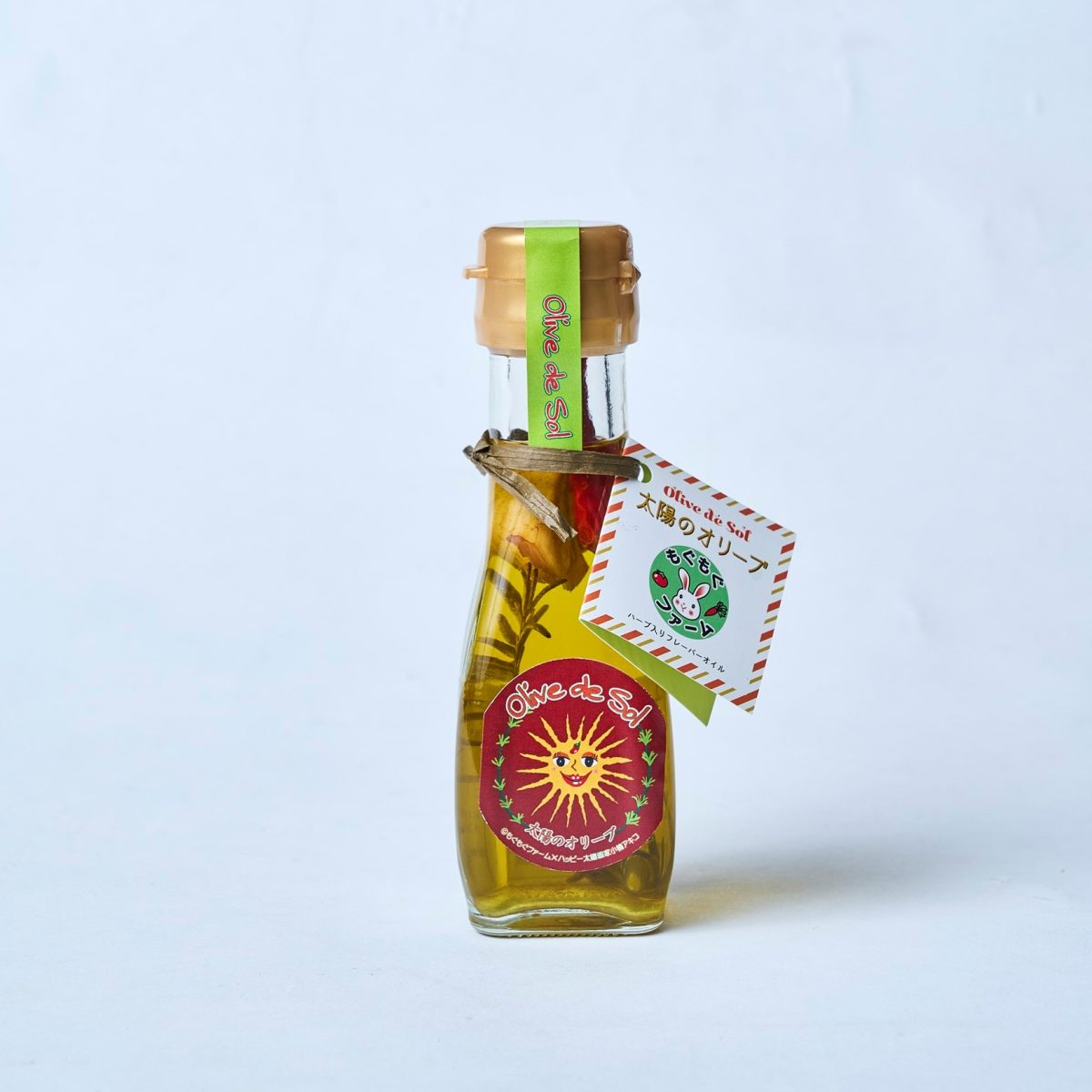 もぐもぐファームが手作りしているオリーブオイル。ローズマリーやニンニクを漬け込んだ、風味の高い逸品。660円