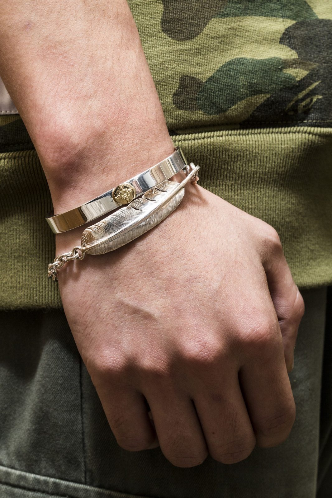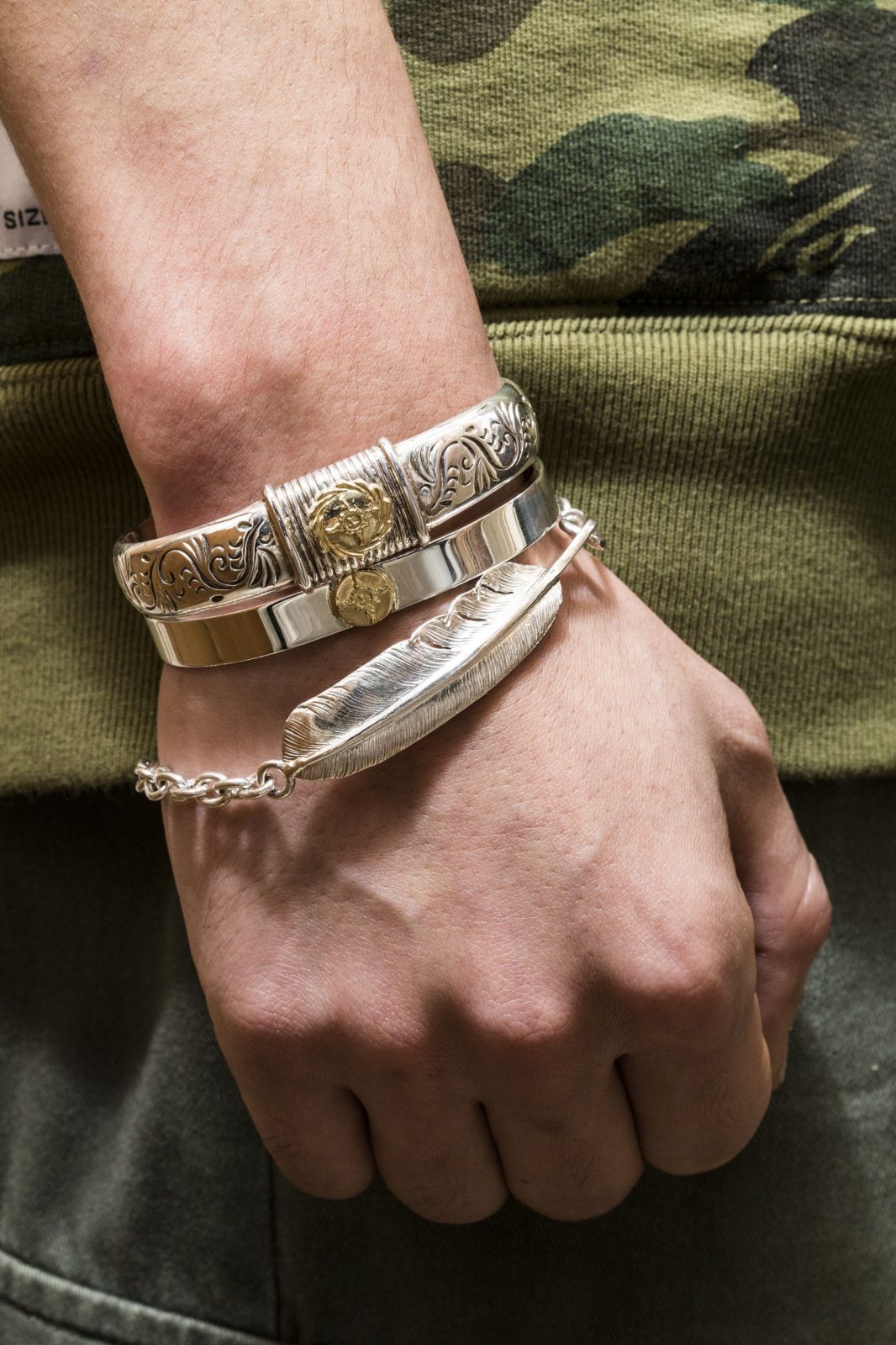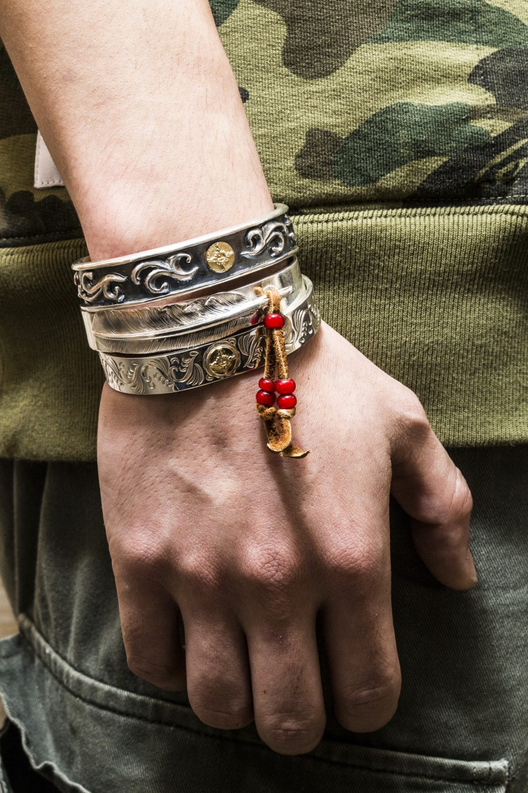 太さの異なるブレスレットを複数個着用する場合、着けやすさやフィット感なども関係するが、バランスが重要となる。定番例としては、手のひら側から順に細、中、太の順で着用することで、バランスのいいシルバーコーディネイトへと仕上がる。