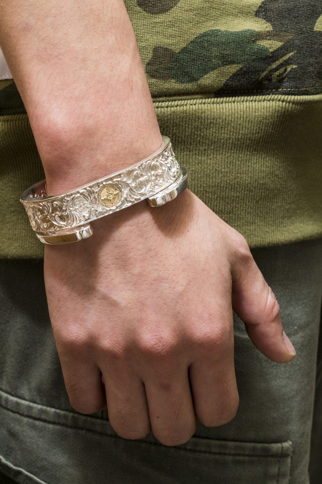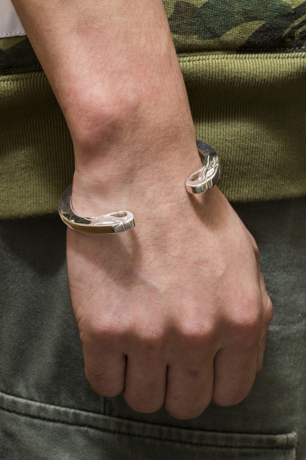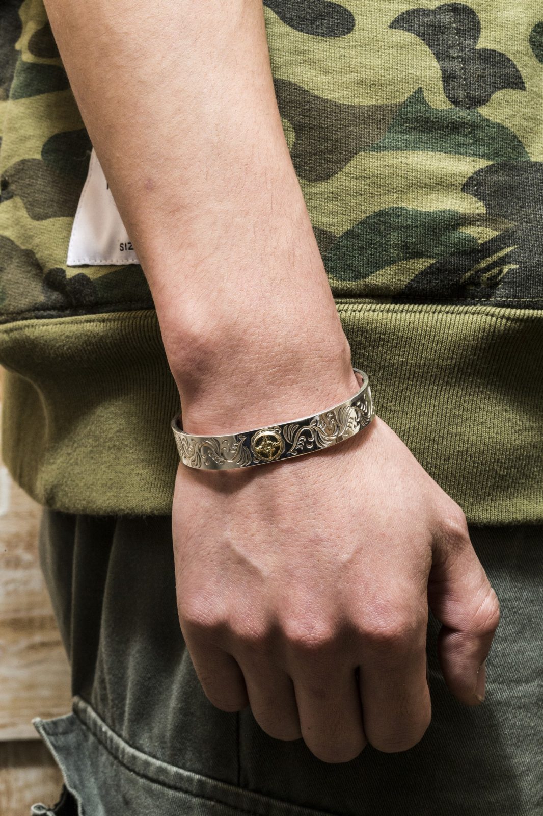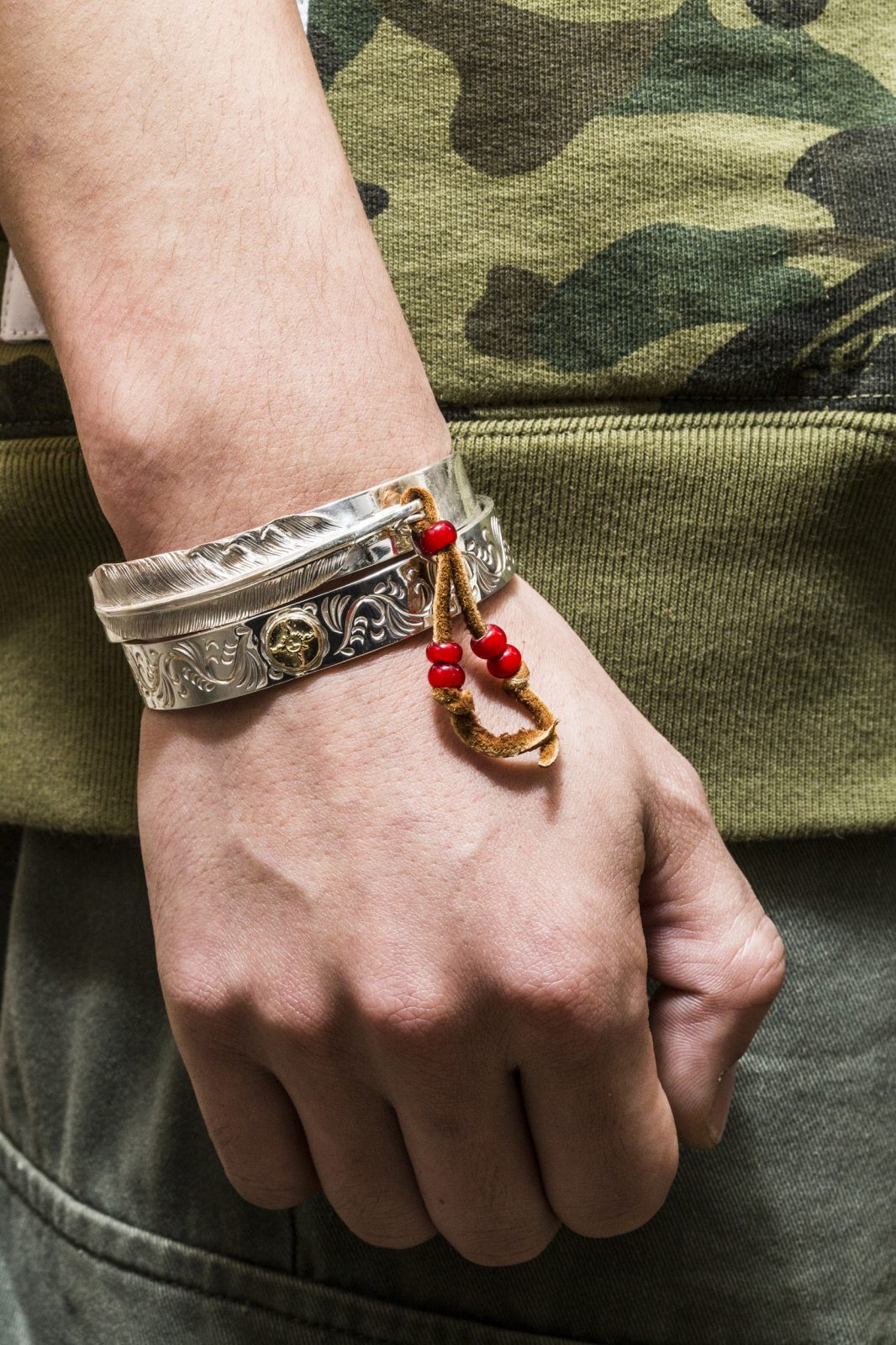 太さの異なるブレスレットを複数個着用する場合、着けやすさやフィット感なども関係するが、バランスが重要となる。定番例としては、手のひら側から順に細、中、太の順で着用することで、バランスのいいシルバーコーディネイトへと仕上がる。