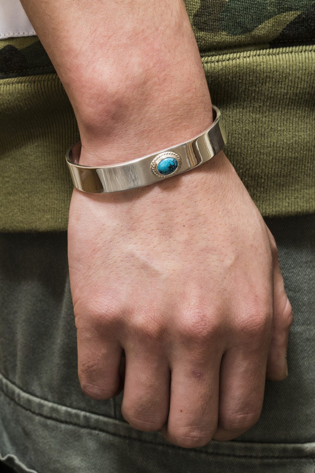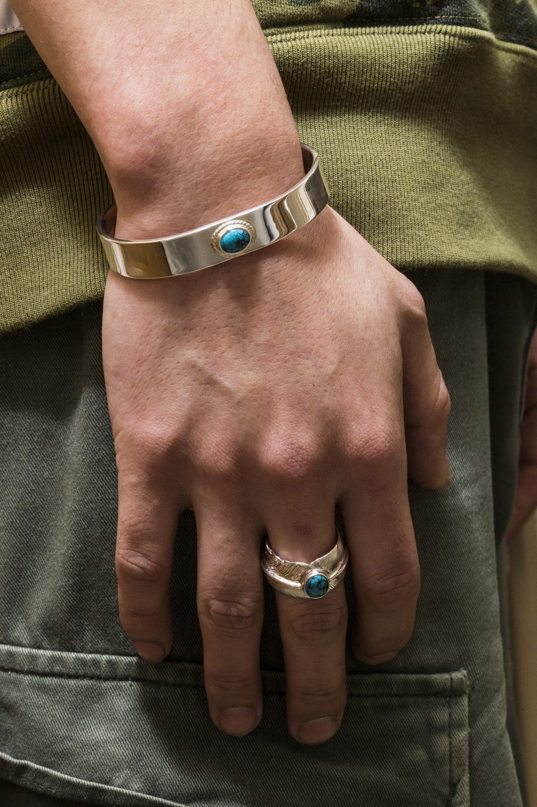 ブレスレットの複数着けだけでなく、たまにはリングとのコーディネイトで幅を広げたい。石入りのブレスレットの場合、例えば、同じ色のターコイズを使用したブレスレットとリングを合わせることで、計算されたスタイリングを作ることができる。