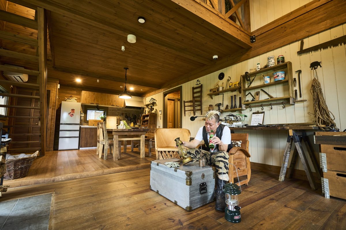 カントリーログの広い土間を活かして、ゆっくりと趣味の道具との対話を楽しみたい。酒を飲みながら、ランタンのメンテに精を出してみる。木の温もりに包まれて、リラックスしながらの趣味時間、最高でしょ?
