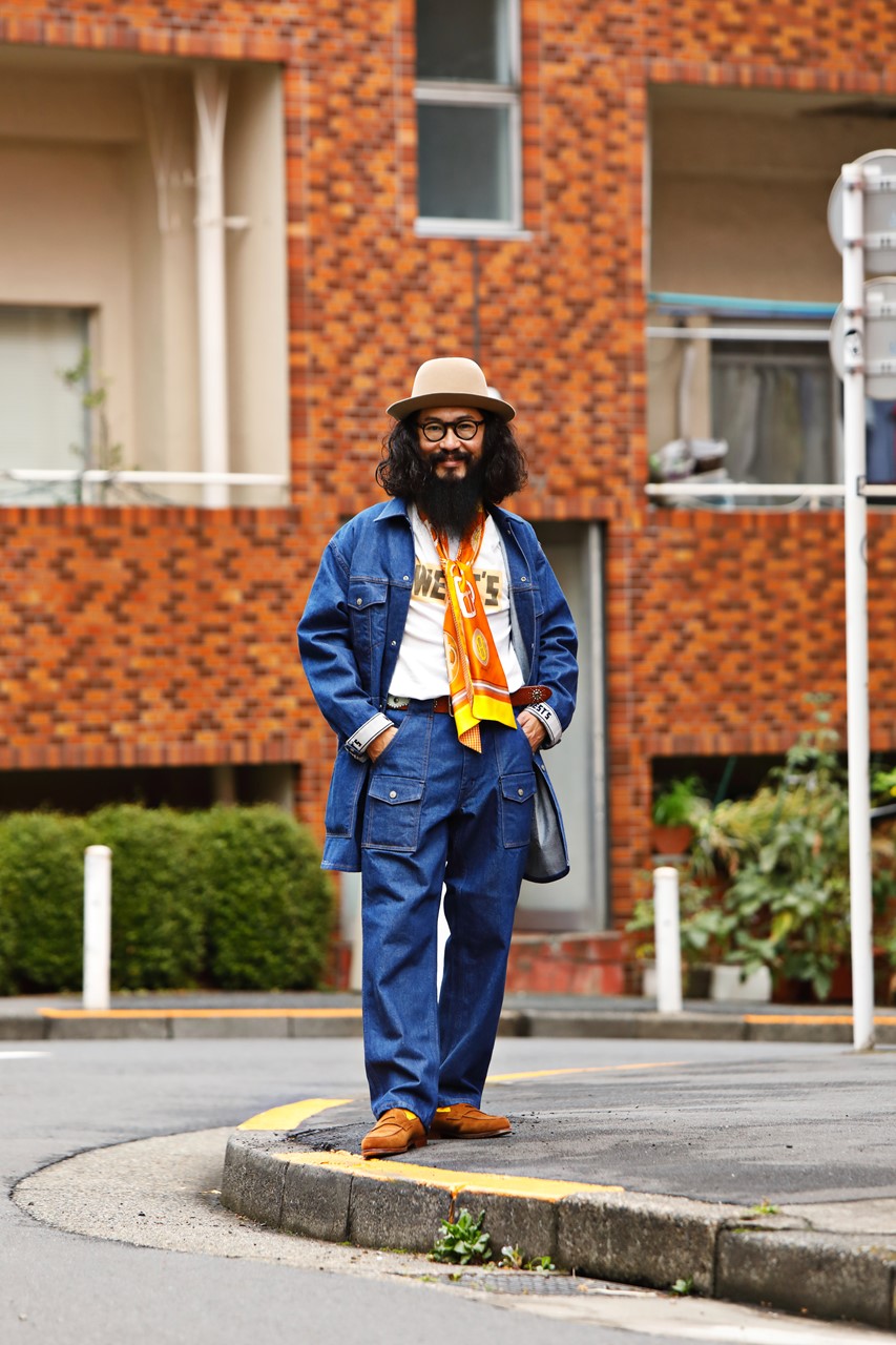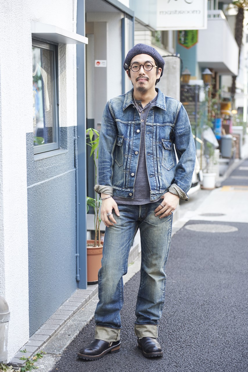 エイジングの効いたアイテム使いで、ブルーで統一感を持たせながらも、コントラストが美しいデニム オン デニムのスタイルを披露してくれた中村さん。帽子やメガネ、アクセサリーの小物使いや、袖のロール幅など随所にコーディネイトのワザが光る。
