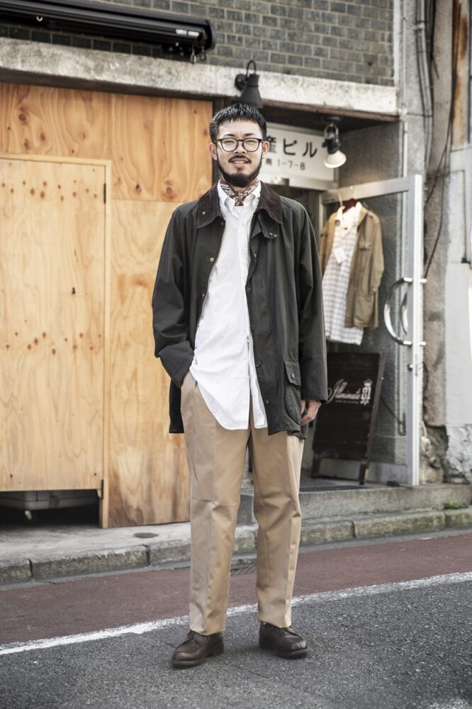 打ち込みの強いツイルを使用したクラシカルなチノトラウザーズは、リッチフィールドのもの。アウターにはオールドのバブアーを着用し、首元のアクセントとしてヴィンテージバンダナをプラスすることで、キレイめな古着ミックススタイルが好印象。