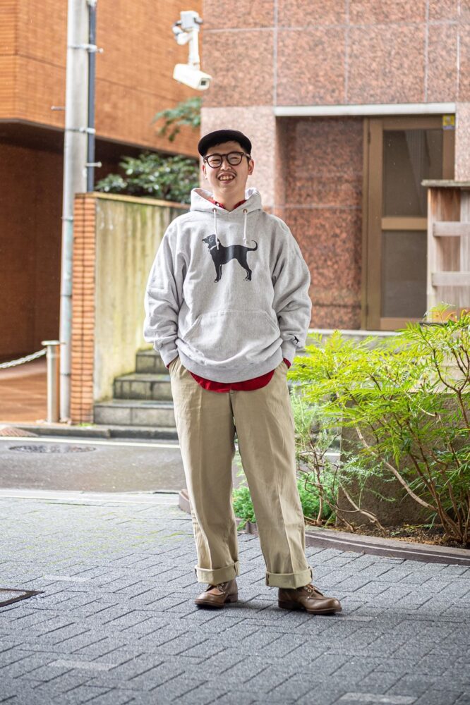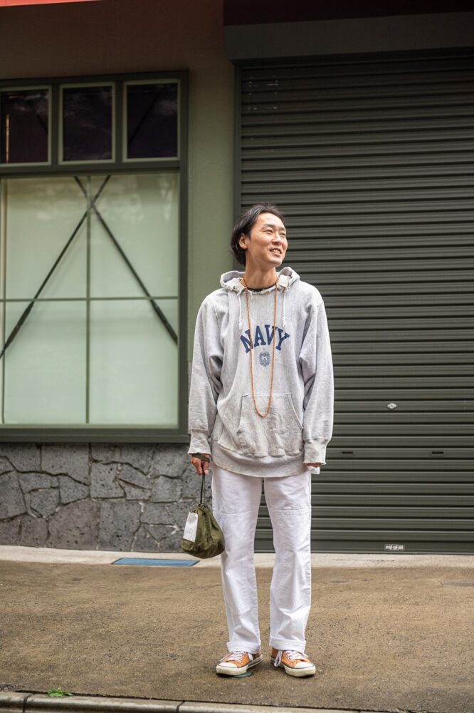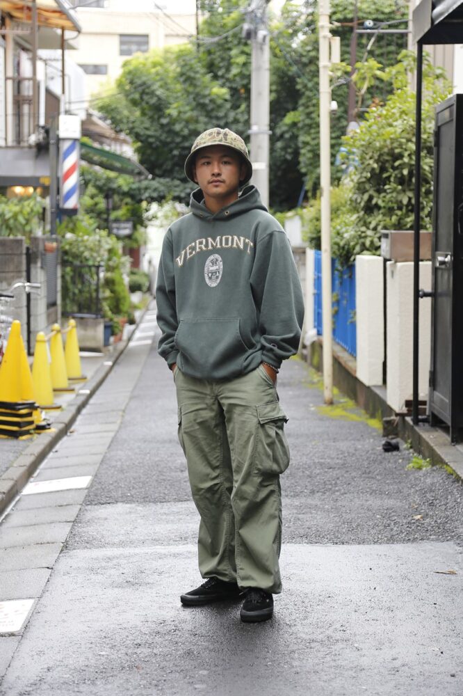 日本を代表するヴィンテージショップのひとつであるベルベルジン。スタッフの青木さんは、パーカにミリタリーのカーゴパンツという王道のコーデ。それでも個性的に見えるのはカラーリングの妙。あえてグリーンのワントーンでまとめたのが正解だ。