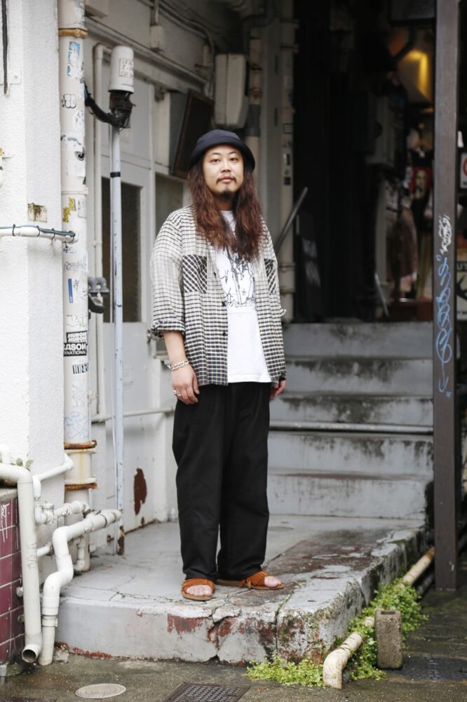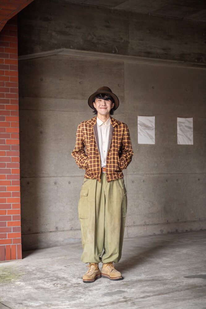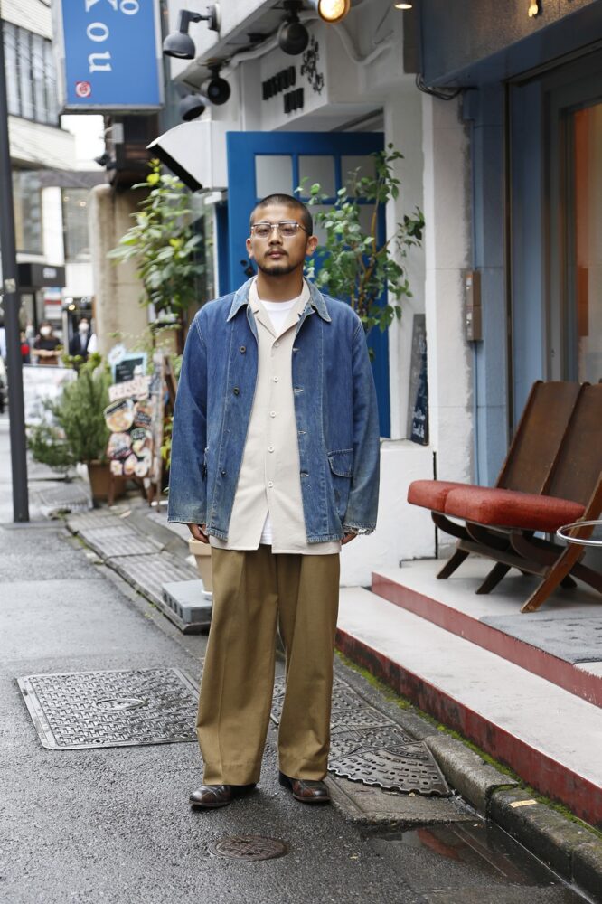 とんちゃん通りにある老舗ヴィンテージショップであるボストックは、良質で手の出しやすいアメリカンクロージングが数多く揃う。原田さんはレアな大戦のカバーオールを太めの2タックスラックスに合わせることで、今っぽい着こなしを実践している。
