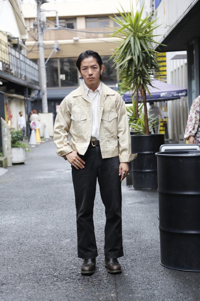 デッドストックまたはミントコンディションのヴィンテージが数多く揃う名店。’50sスタイルを得意としており、古橋さんも体現。コンディション抜群のリーバイスのサテンジャケットに、リーのフリスコパンツをチョイス。足元はPT91でより男くさく!