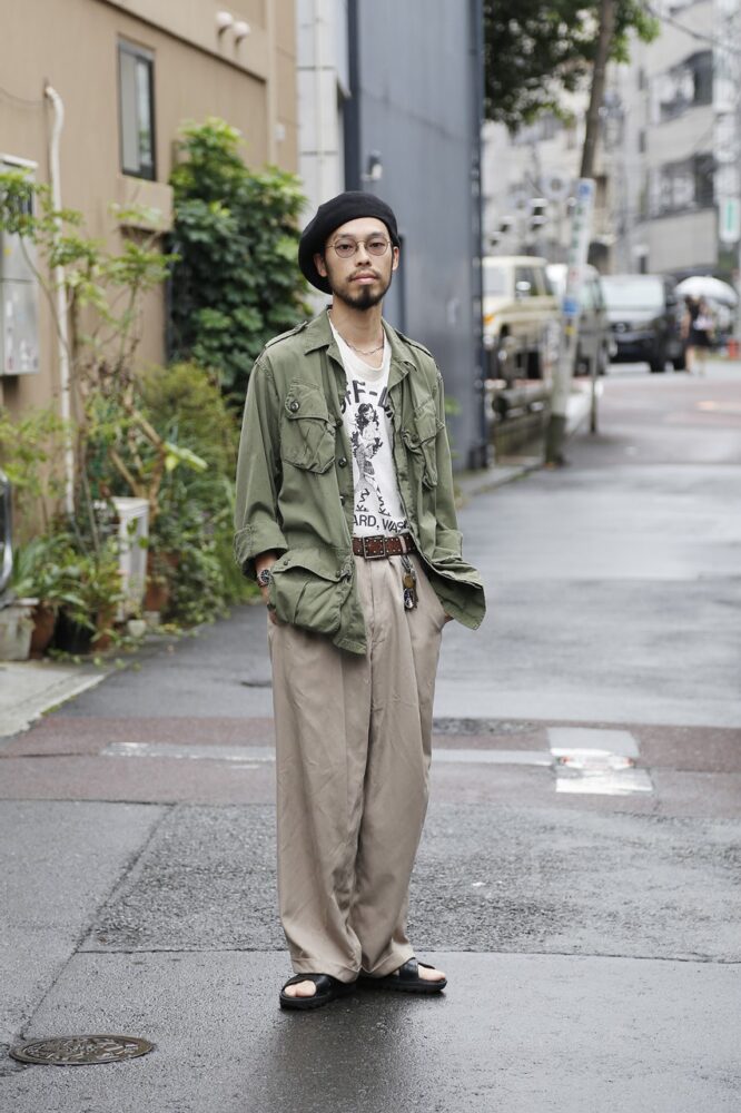 別格に数少ないジャングルファティーグジャケットの最初期モデルをサラッとした着こなしたオーナーの林田さん。この手のミリタリージャケットは、あえてスラックスに合わせるのがトレンド。インナーに遊びの効いたTシャツをセレクトしたのも正解!