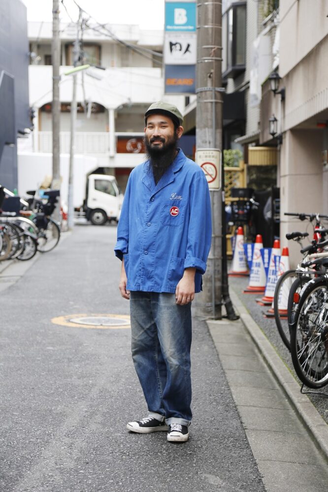 柏の名店であるグリーフルの下北沢店。マネージャーの本谷さんは、カバーオールにデニムパンツという王道のワークスタイルだが、こなれて見えるのはキャスケット使いと足元のスニーカー。自身で色落ちさせたというRRLのエイジングが、お見事!