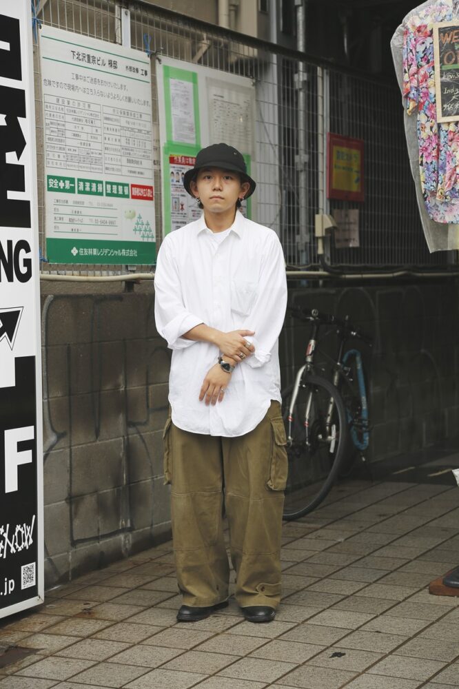 白シャツにミリタリーパンツというお決まりのスタイルでも個性的に魅せられる好例。鍵となるのは、太めのボトムス。ここ数年ですっかりと市民権を得たフランス軍のM47を着用。ハットとシューズのカラーリングをブラックで統一したのも注目したい。