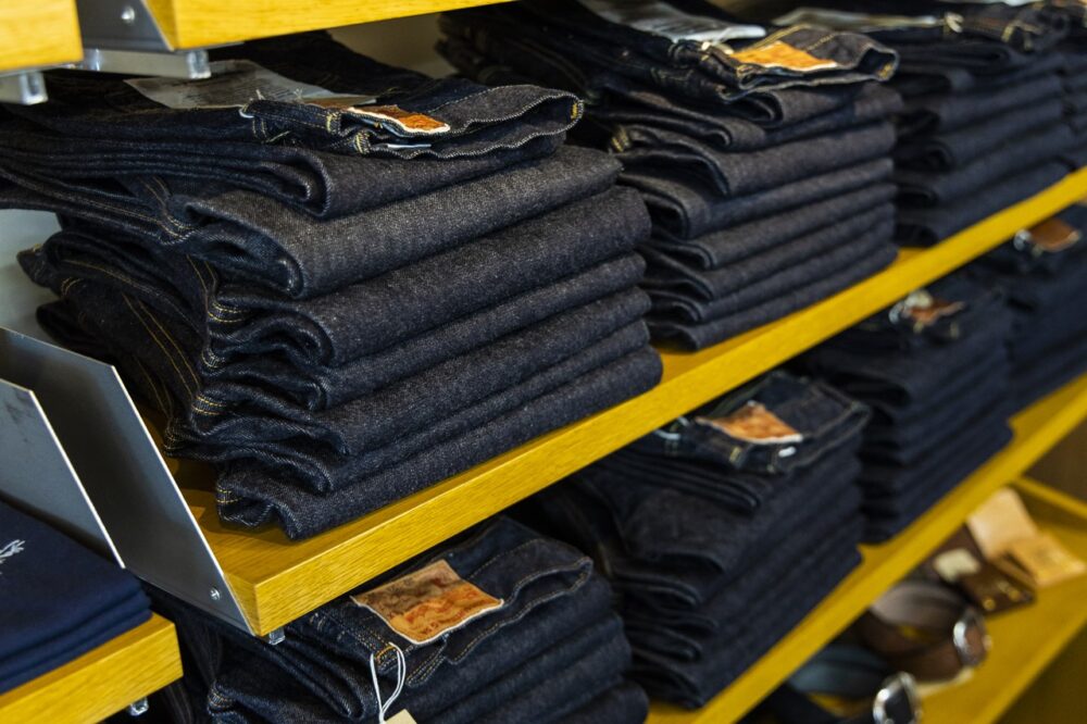 ダルチの顔とも言えるデニムはフルラインナップ。新作もいち早く投入されるのは、生産拠点のお膝元だからこそ。思う存分デニム選びに没頭できる。