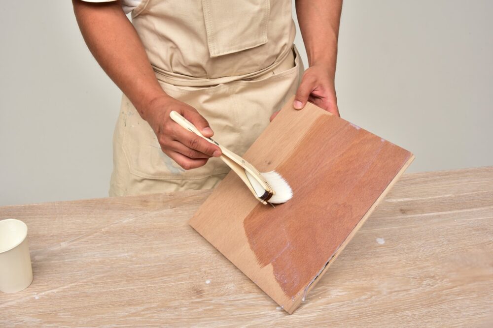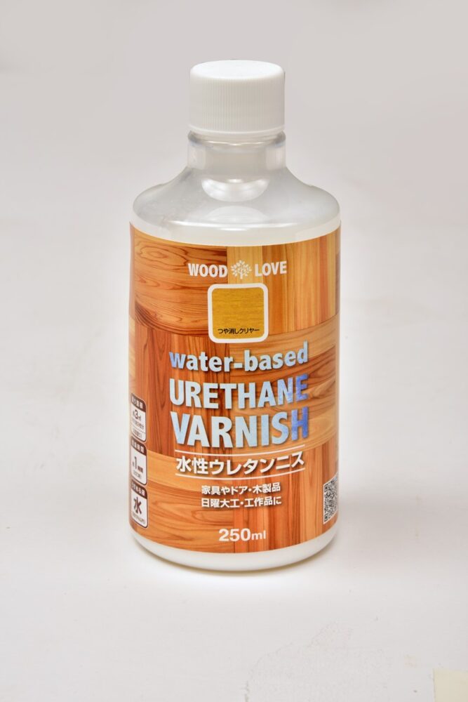 木材に艶を出すためにニスを使用。好みによって、ワックスやワトコオイル、塗料など使ってもOKだ。965円
