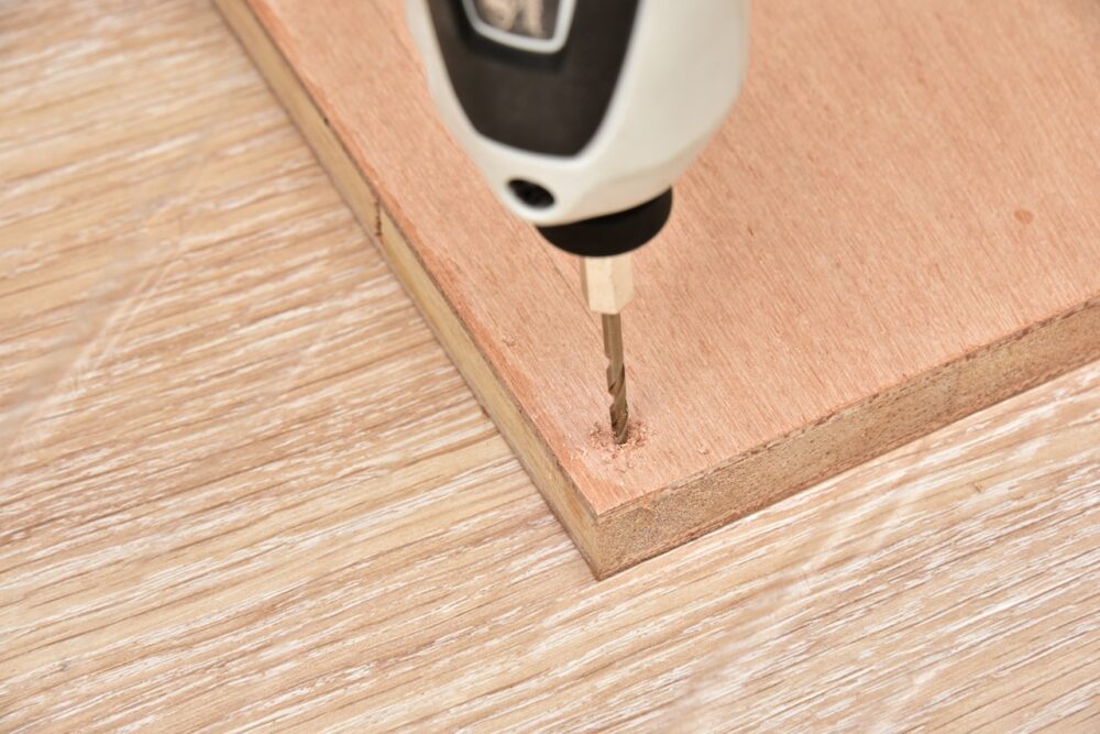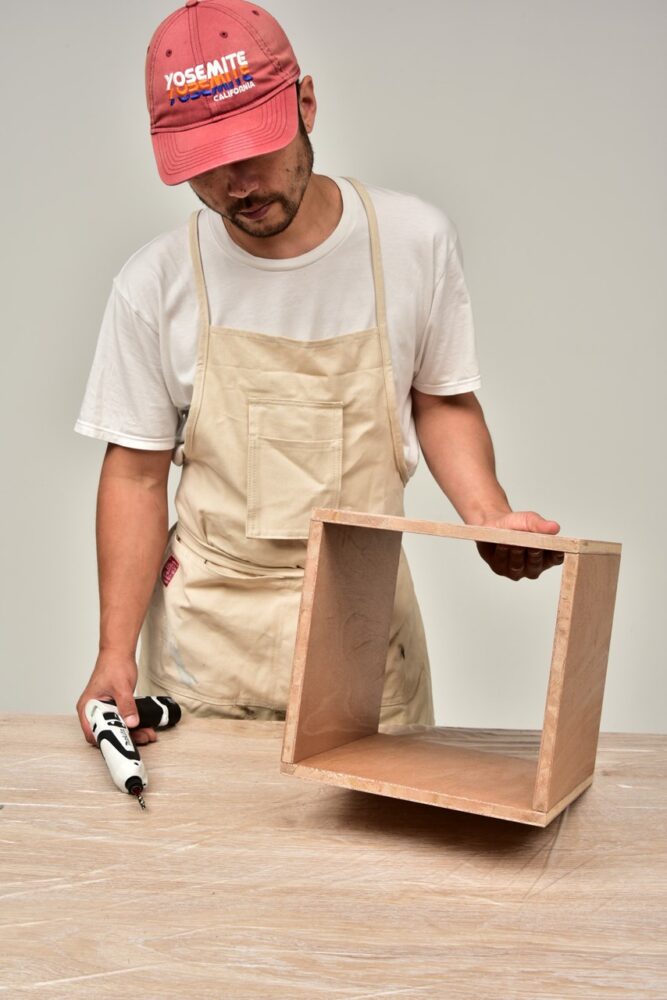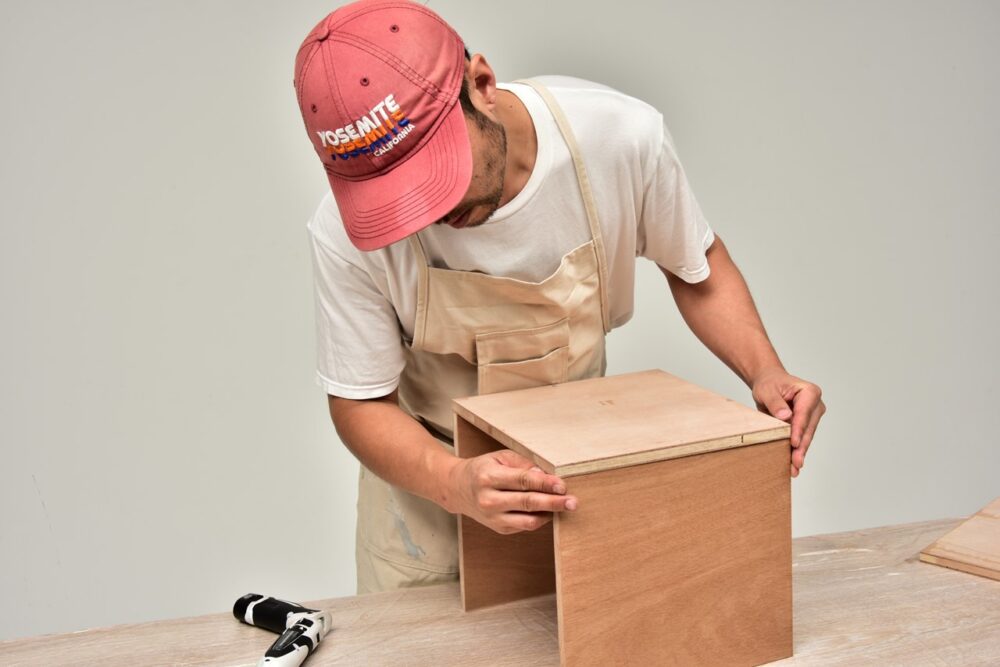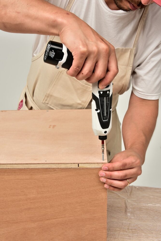 ボックスを組み立てる。ビスを打つ前にそれぞれ角にドリルで穴を開けてからそこにビスを打つ。先に穴を開けることで木材が割れるのを防ぐ。