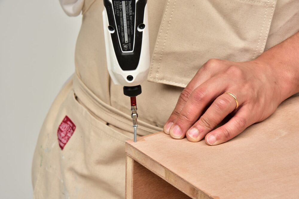 同じようにすべての接続部分にビスを打ち、組み立てていく。板の厚みが15㎜と薄いので、ゆっくりと作業するのがコツだ。