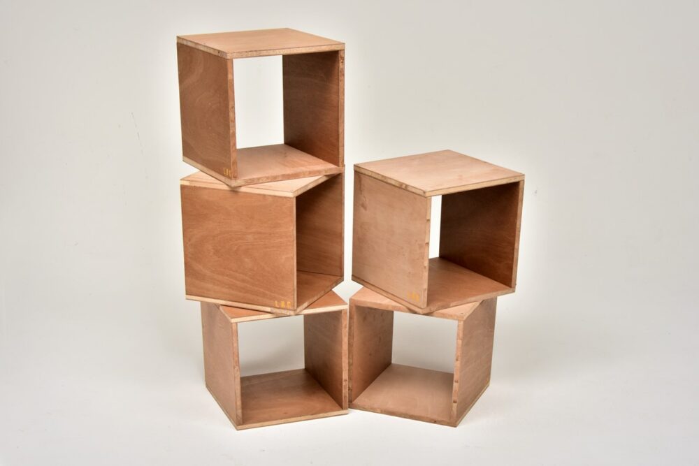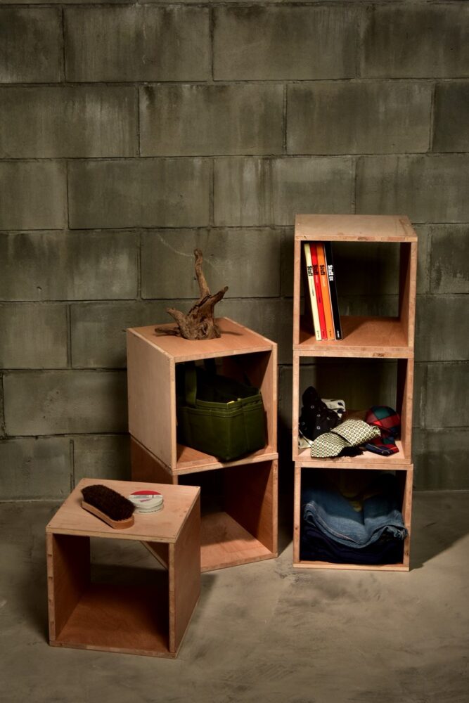 写真を見てもわかるように仕組みはとても簡単。4枚の板を組み合わせるだけ。これを必要な数だけ作っておけば、縦に重ねたり横に並べたりするだけで収納ボックスになるというわけ。リビングのディスプレイボックスにしてもいいし、子ども部屋の本棚にしてもいい。玄関に置けばブーツなどの収納&ディスプレイにもなり、使う人によってその用途は十人十色だ。