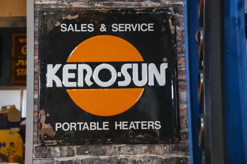 持ち運びできる灯油ヒーターを手がけるKERO︲SUNの看板。いい感じのヤレ具合。2万3840円