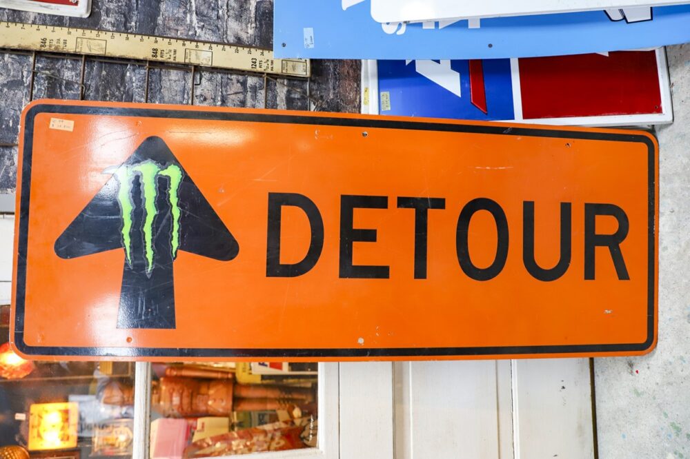 DETOUR(迂回)のロードサイン。モンスタードリンクのステッカーが貼られている。1万6800円