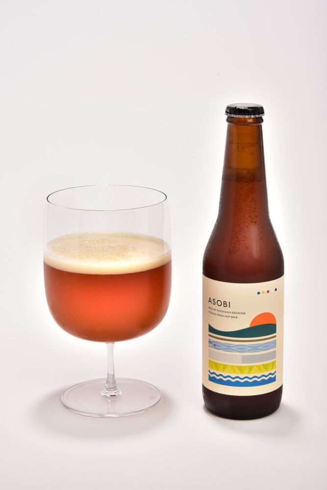 与謝野町の若者が集まり立ち上げた「かけはしブルーイング」のASOBIは、与謝野ホップの豊かな香りとモルトの甘みが楽しめる味わい深いペールエール。アルコール度数:5%、内容量:330ml、4本セット/ 2860円(かけはしブルーイング https://kakehashi.beer/)