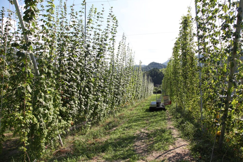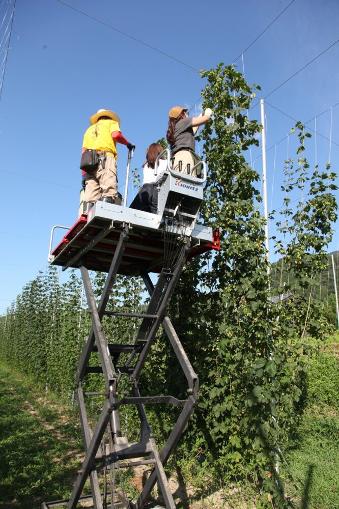 こちらがホップ畑。多くの産地ではツルを切り落とし摘果機で収穫するが、与謝野ホップは丁寧に手摘みしていく。