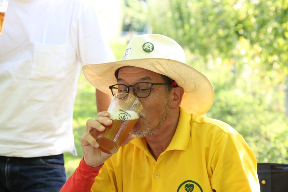 収穫でひと汗かいた後は、お待ちかねのビールタイム! もちろん飲むのは、与謝野ホップを使用したクラフトビール。ホップの苦みと豊かな香りが、疲れた体に染み渡る。
