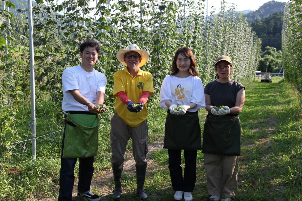 与謝野ホップ収穫体験に参加した皆さんと、発起人の藤原ヒロユキさん(左から2人目)。みな楽しそうでした!