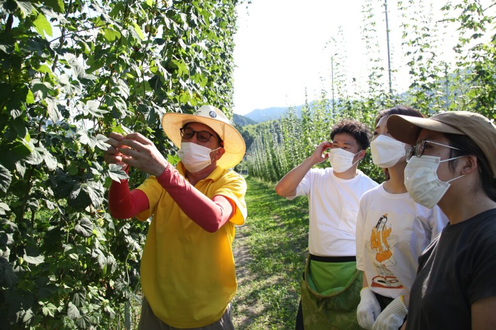 まずはホップ畑の管理者である藤原ヒロユキさんから、収穫の仕方や、ホップの見極め方などを習う。みな真剣に話に耳を傾けていた。