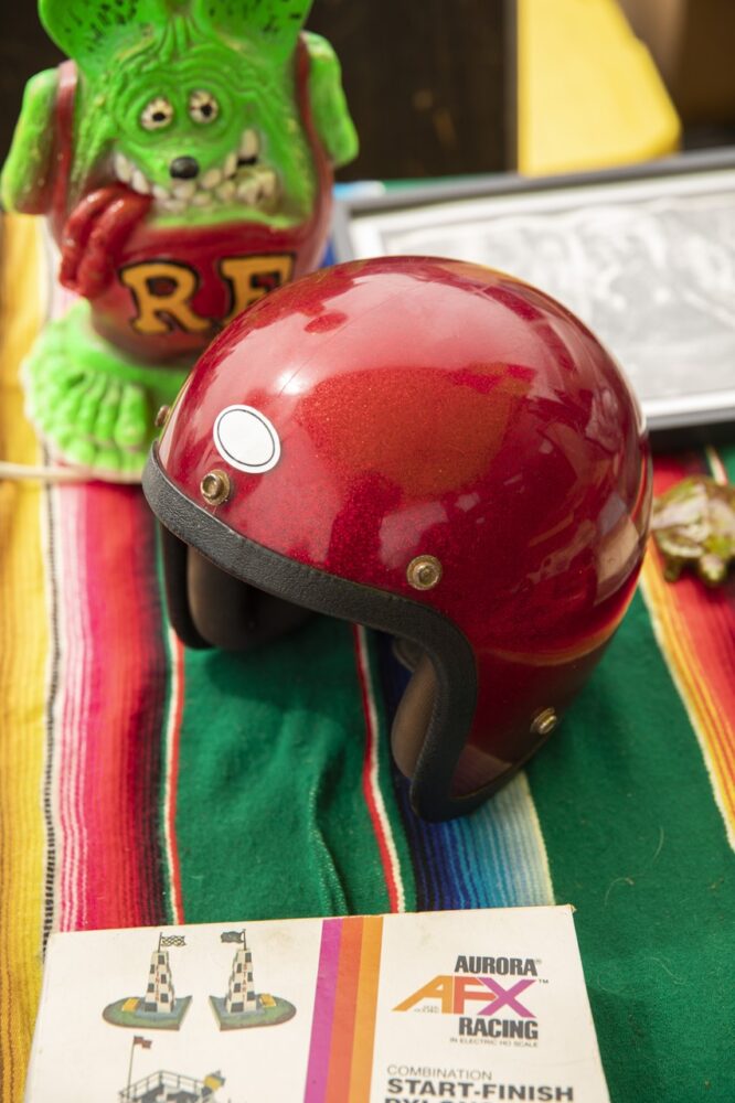 フレーク塗装がいかにも’70 年代らしいジェットヘルメットは外装はキレイそのもの。40ドル