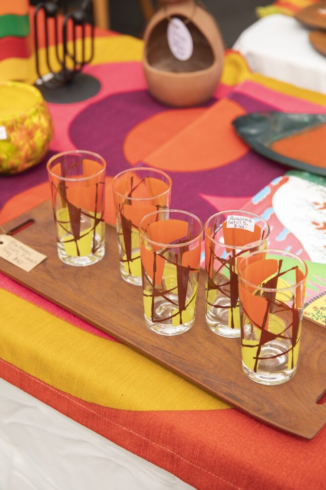 ミッドセンチュリーの時代を色濃く反映したプリントが入るコップは5つセットで45ドル。モダンファニチャーと相性が良いアイテム。