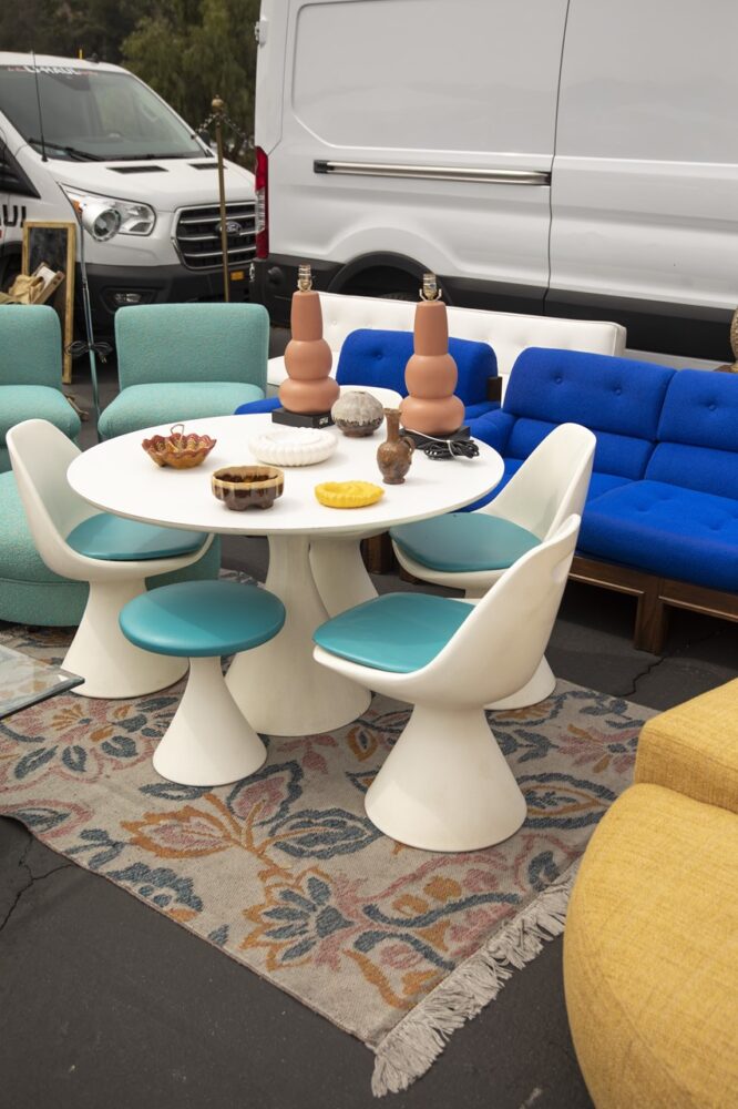 ミッドセンチュリーのデザインが爆発してるテーブルとチェアのダイニングセット。オースチン・パワーズに出てきそうな家具だね。