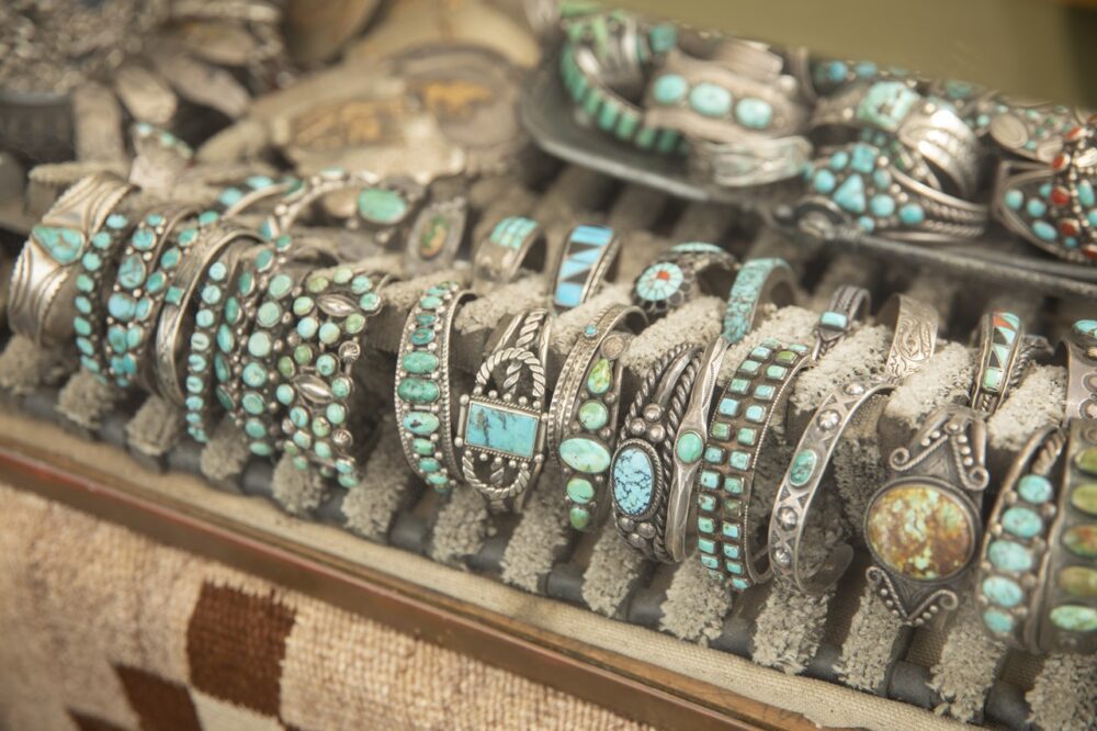 ネイティブ系ジュエリーも専門ディーラーが数多く出店している。ターコイズ付きのバングルだけでも豊作である。