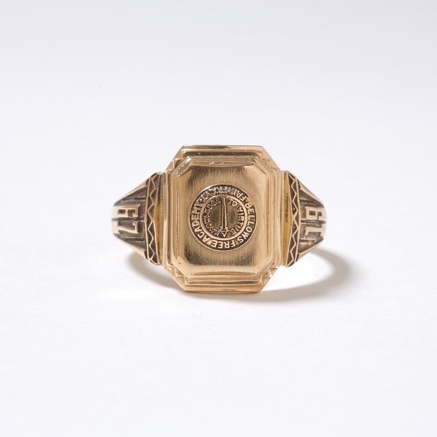 バーモント州フェアファックスにある教育機関のリングは、1967年製。台座を用いたクラシックなデザインで10金を使用する。6万円