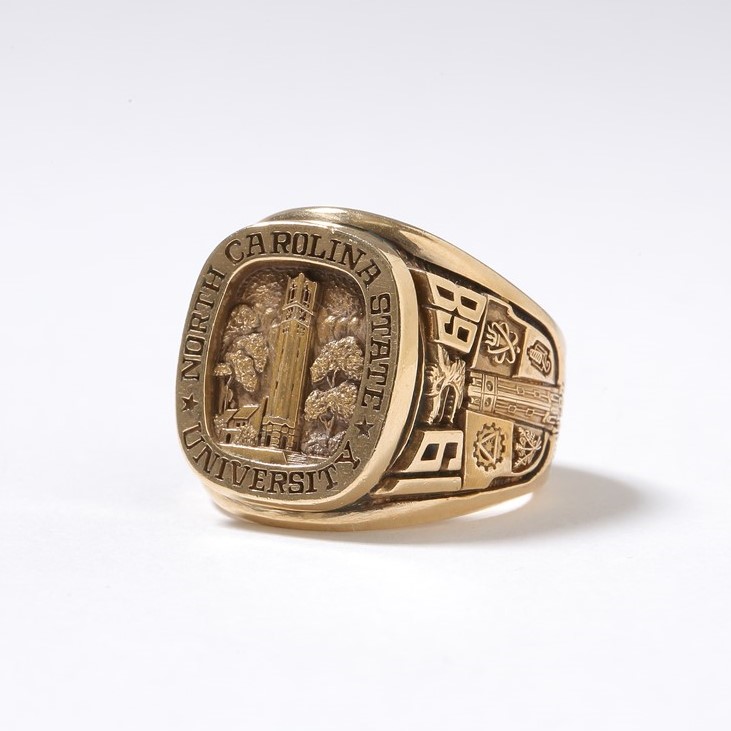 センターに校舎が描写された細かなデザインが光るカレッジリングは、ノースカロライナ州立大学のもの。アメリカらしい10金イエローゴールド製。14万円