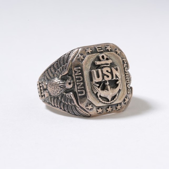 カレッジリングは出自がミリタリーという説に納得するほど、米海軍でも様々なバリエーションがある。こちらはスーベニアで、E PLURIBUS UNUMというスローガンもデザインされている。1万8000円